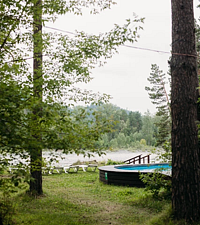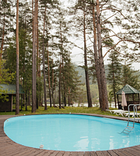 Бассейн с подогревом в окружении соснового леса с шикарным видом на Катунь и горы Алтая.