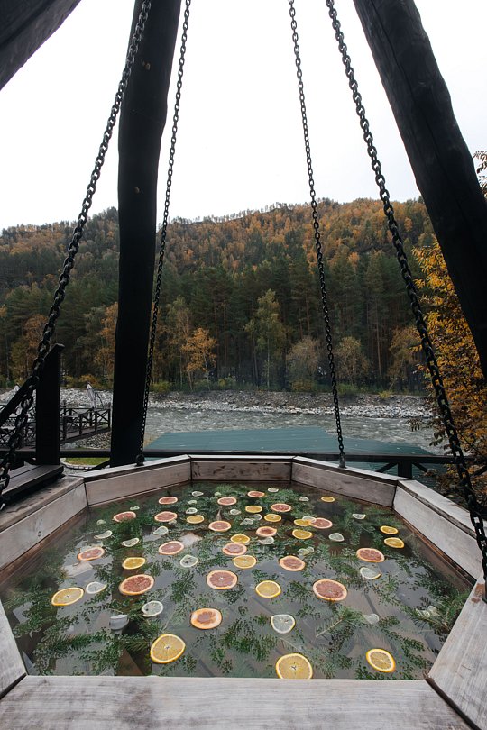 Завершите банные процедуры в банном чане под открытым небом на берегу реки Чемал с потрясающим видом на горы и сосновые леса. Вы почувствуете себя обновлёнными, ощутите долгожданную гармонию с собой и с природой, которая поможет вам уверенно встать на путь здоровья и долголетия.