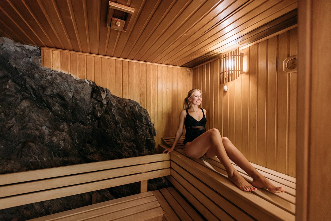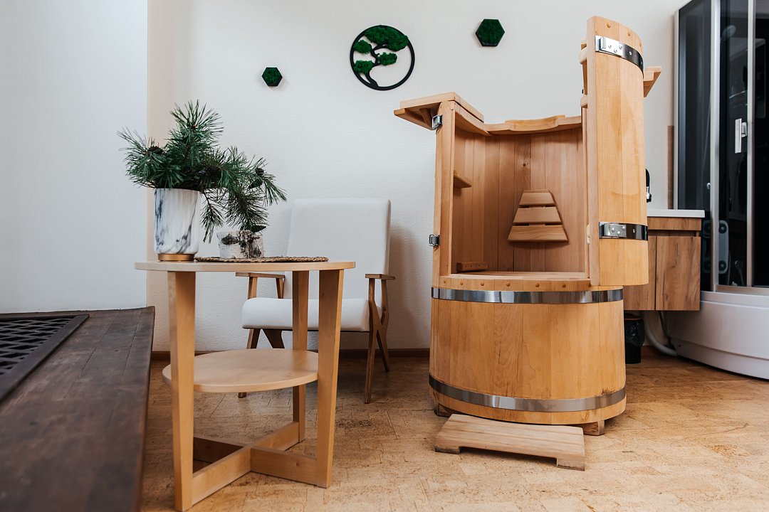 Читать полностьюДровяная печь и настоящая скала в финской сауне символизируют стихии Огня и Земли. Финская сауна характеризуется низкой влажностью около 20% и горячим сухим воздухом, достигающим 100 ºС. Сухой воздух равномерно нагревает тело, а выделяющийся пот охлаждает кожу естественным путем. Соляные лампы, установленные в сауне, стимулируют иммунитет. В результате нагревания появляются пары соли, которые способствуют омоложению клеток, успокоению нервной системы, благотворно влияют на бронхо-лёгочную систему, уменьшают болевые ощущения и расслабляют.