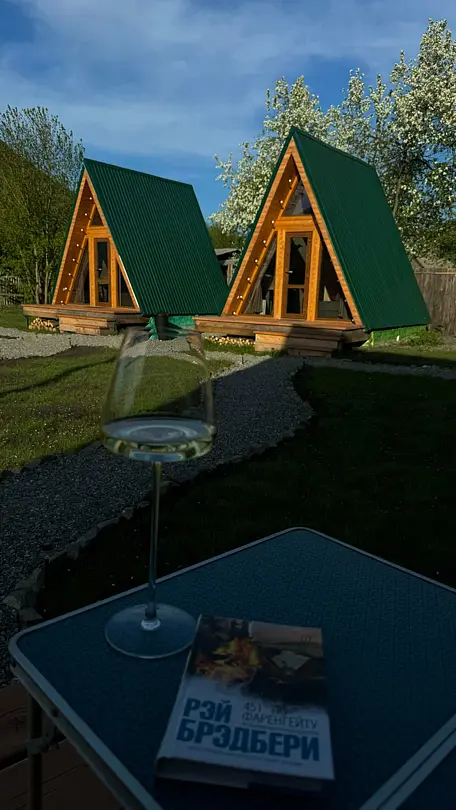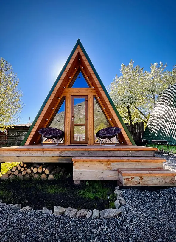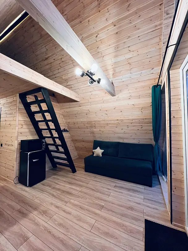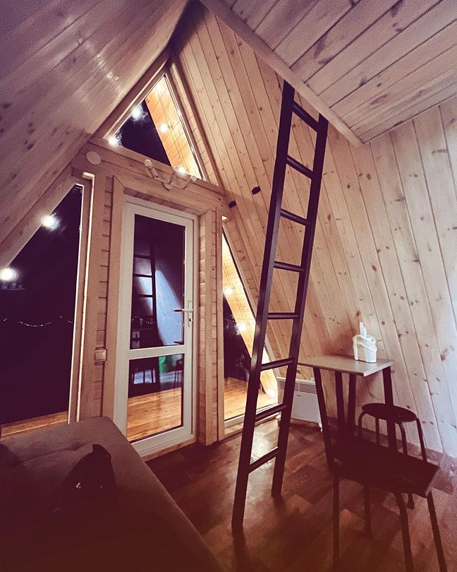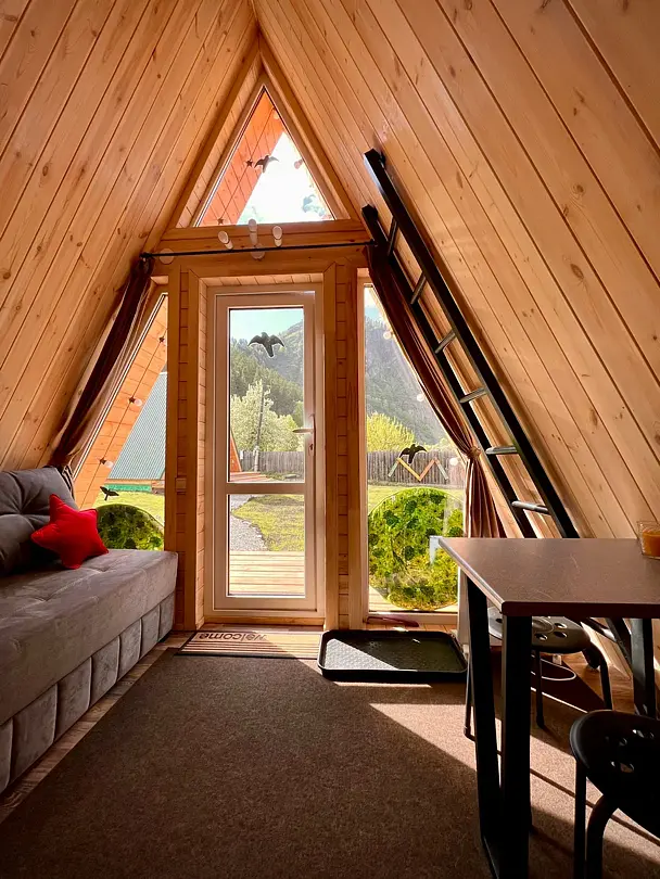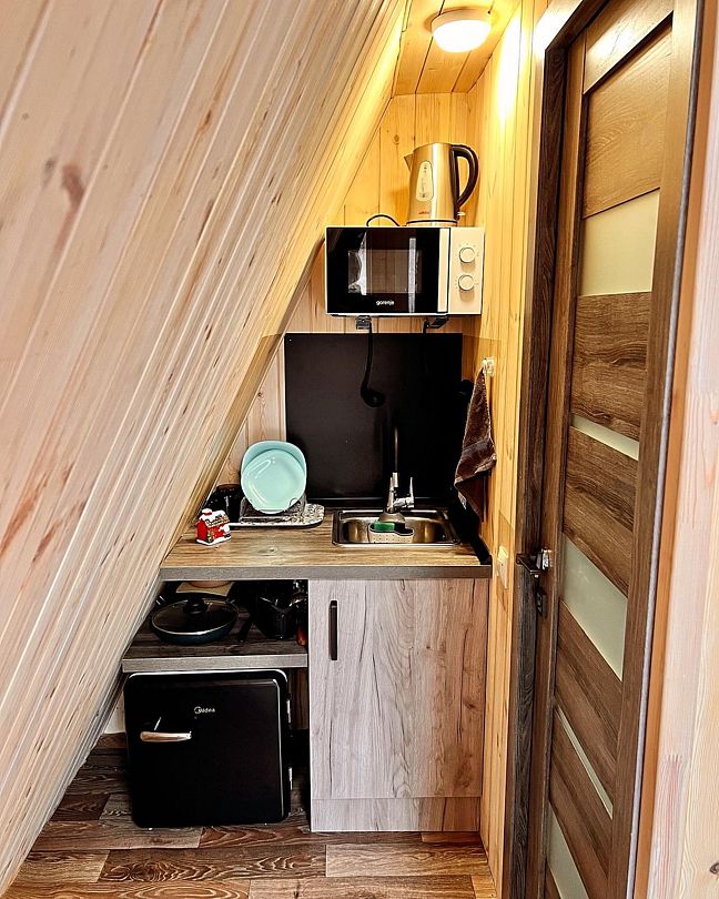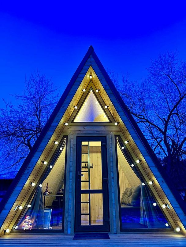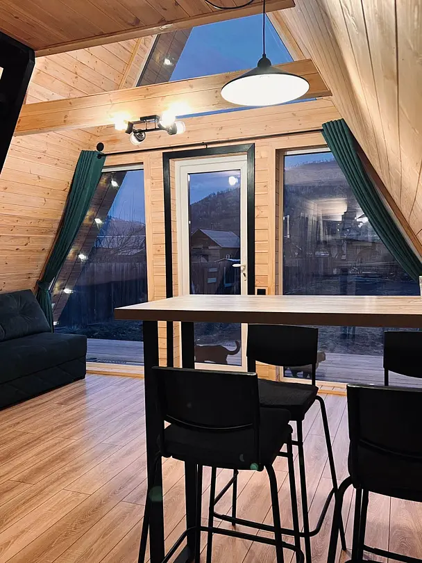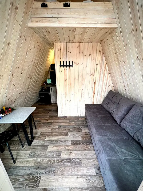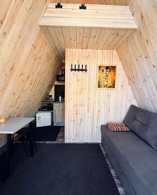 Уютные домики типа А-фрейм оснащены всем необходимым для комфортного проживания: спальными местами, санузлом с душем, оборудованной кухней, набором посуды, телевизором и прочими удобствами.