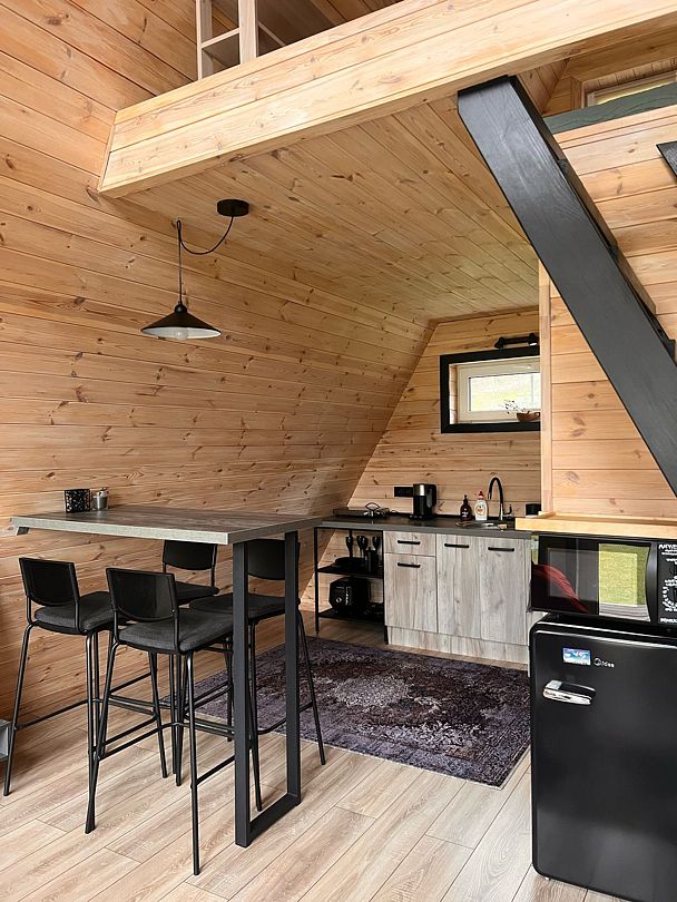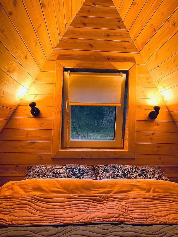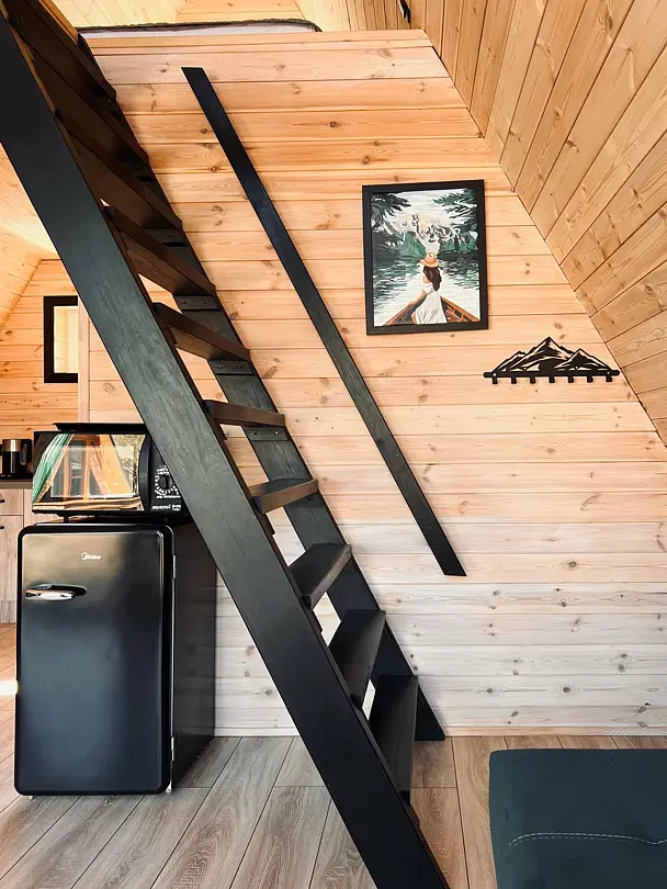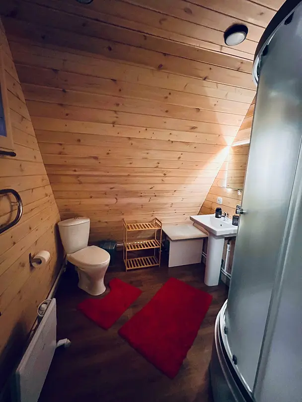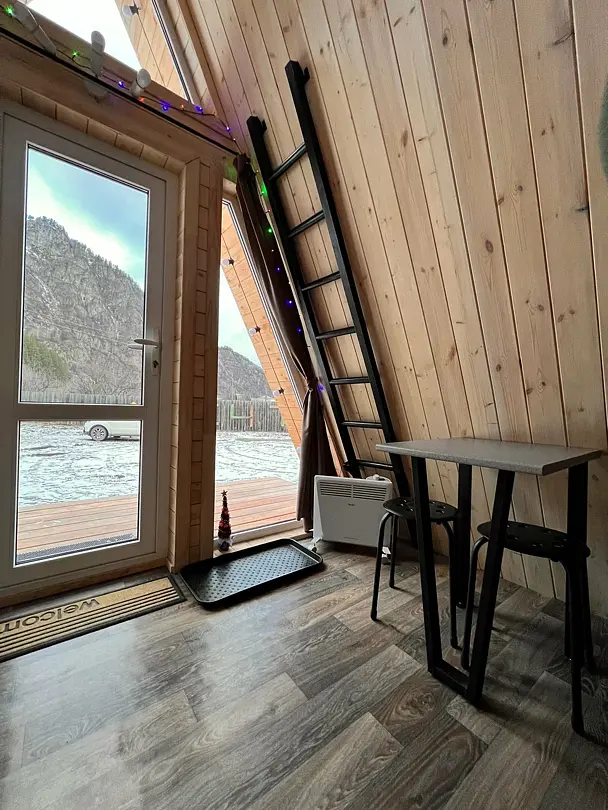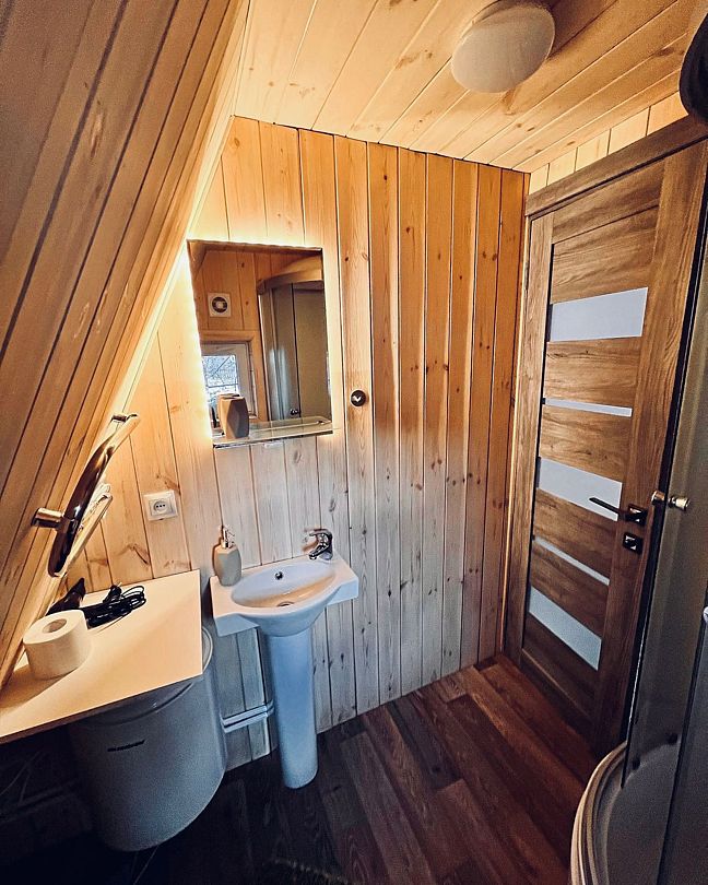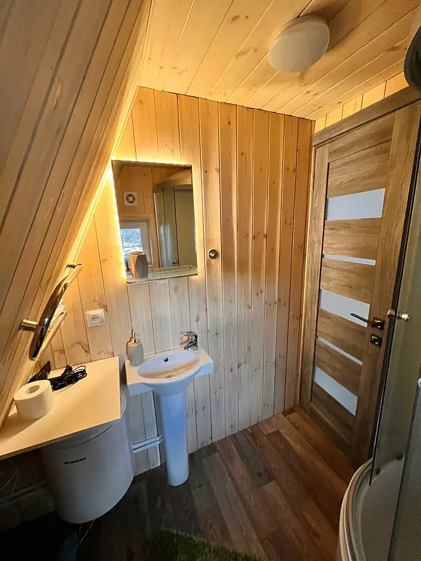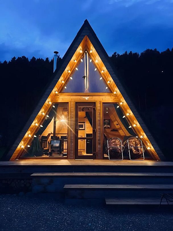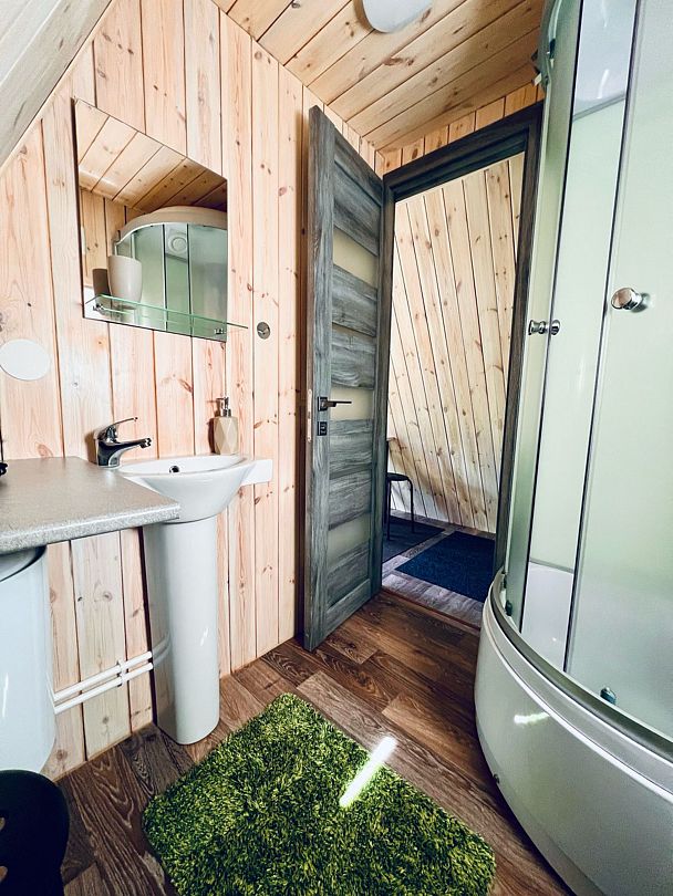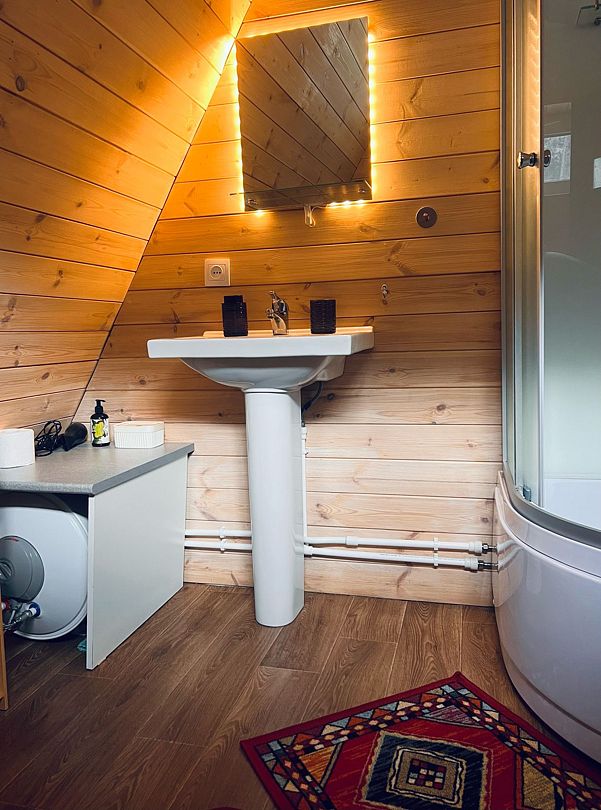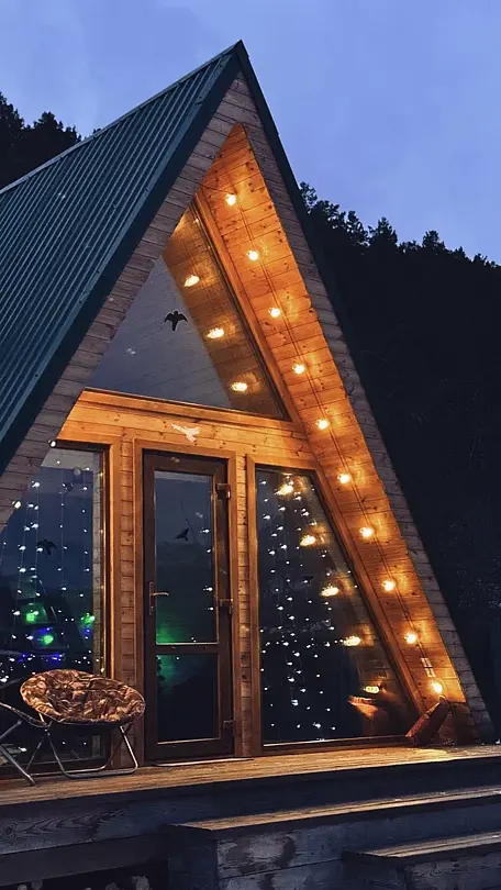 Уютные домики типа А-фрейм оснащены всем необходимым для комфортного проживания: спальными местами, санузлом с душем, оборудованной кухней, набором посуды, телевизором и прочими удобствами.