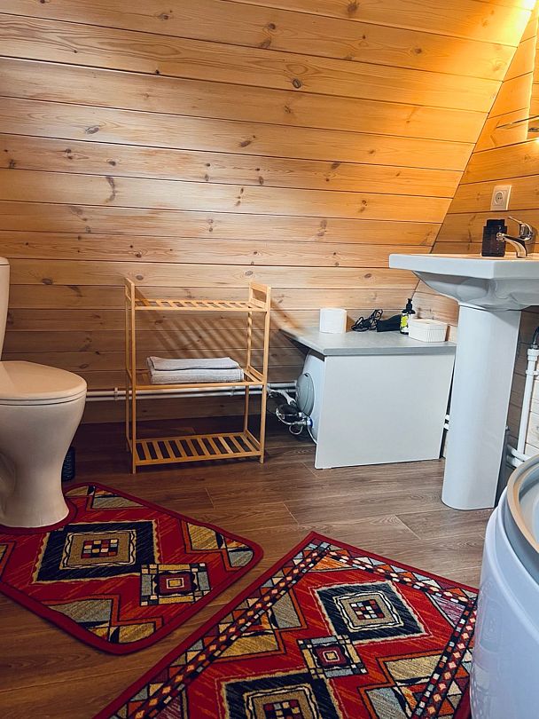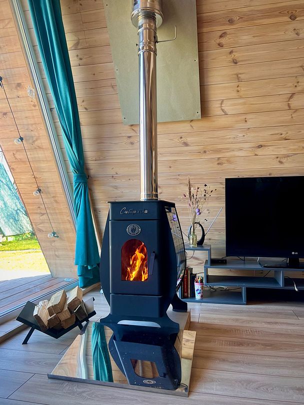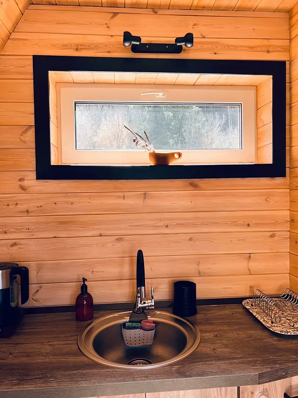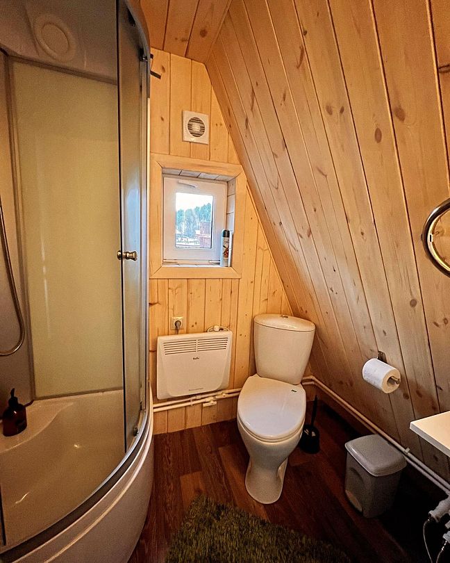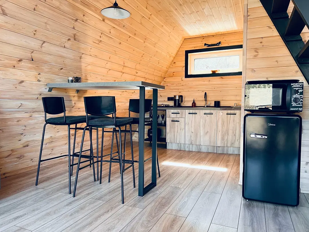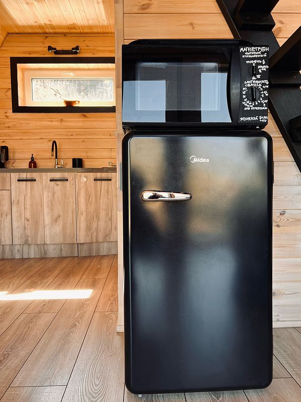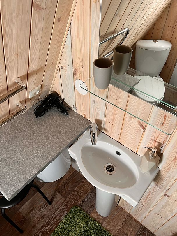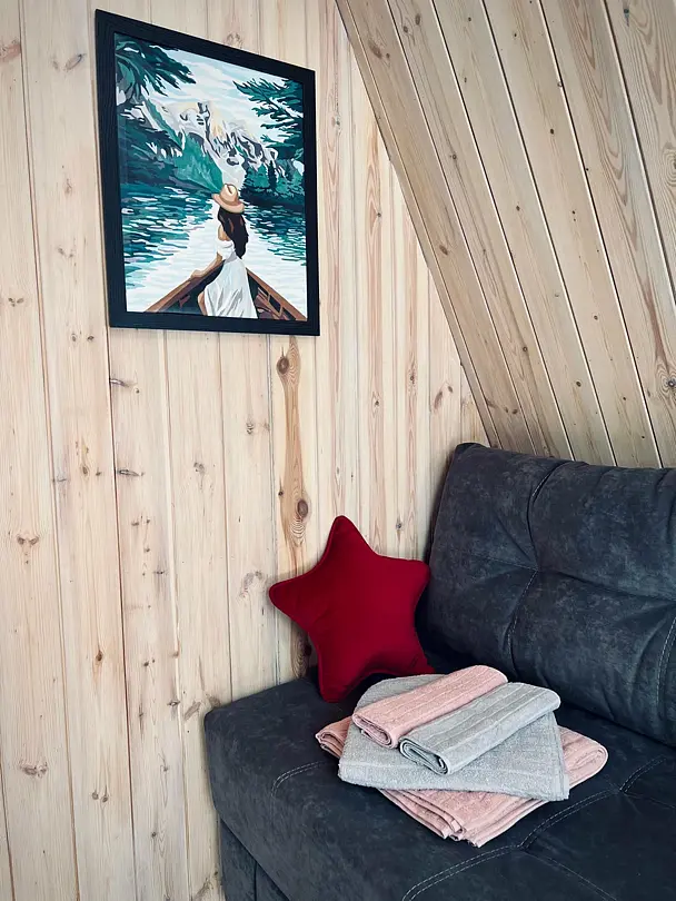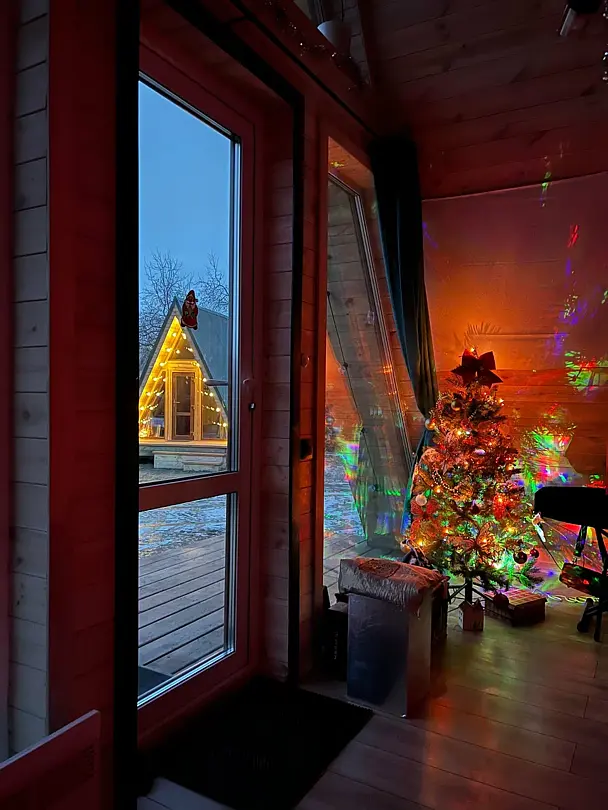 Уютные домики типа А-фрейм оснащены всем необходимым для комфортного проживания: спальными местами, санузлом с душем, оборудованной кухней, набором посуды, телевизором и прочими удобствами.