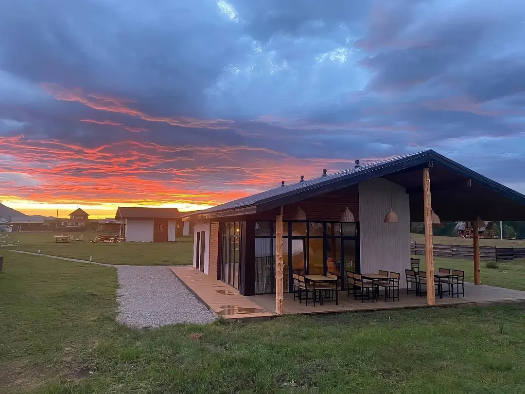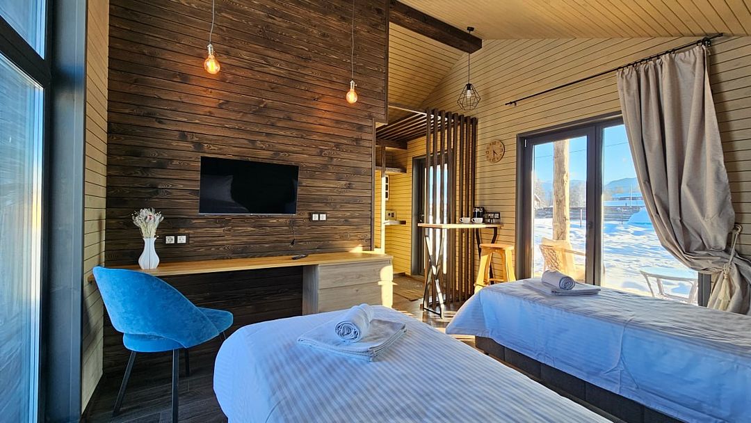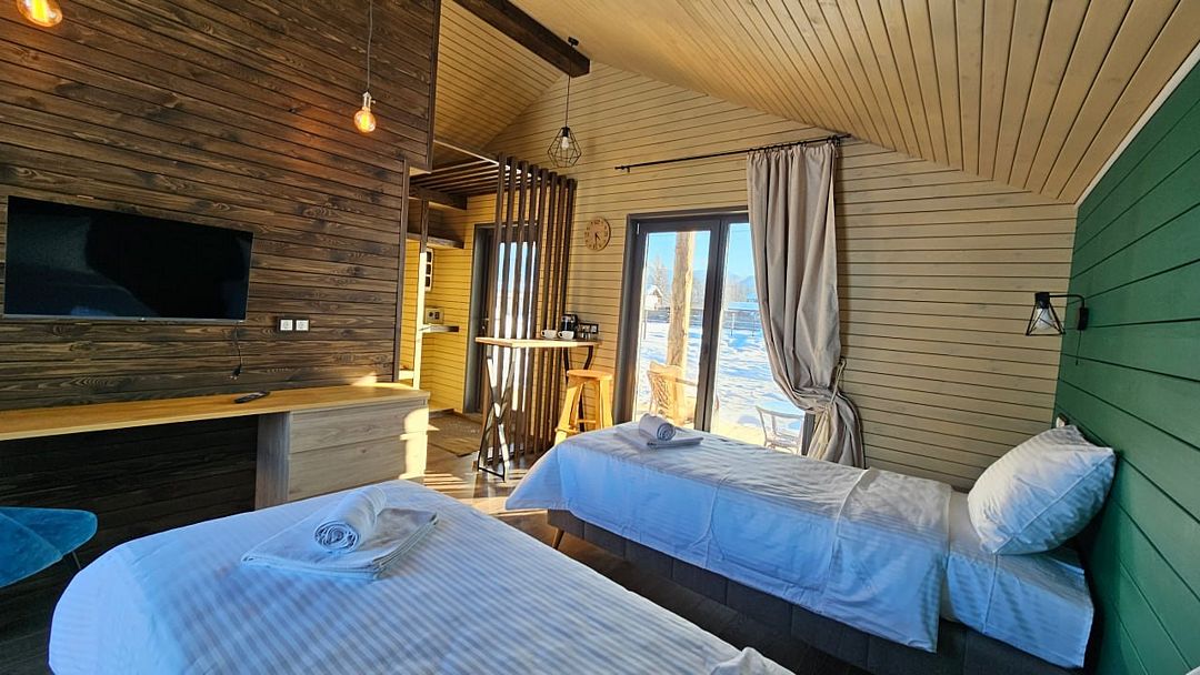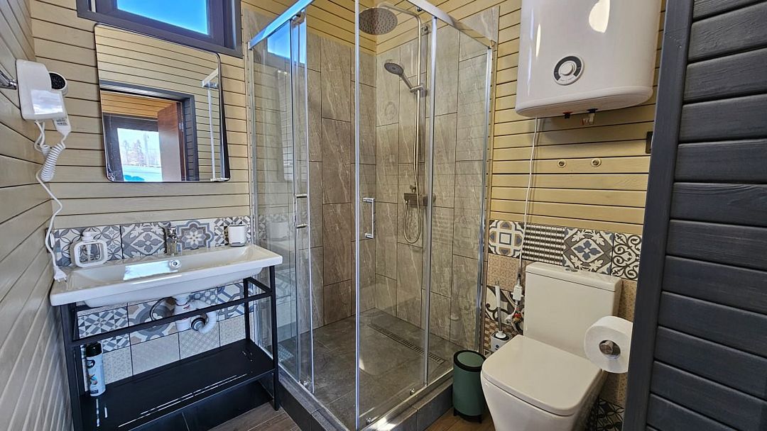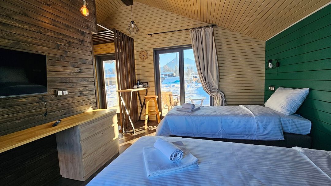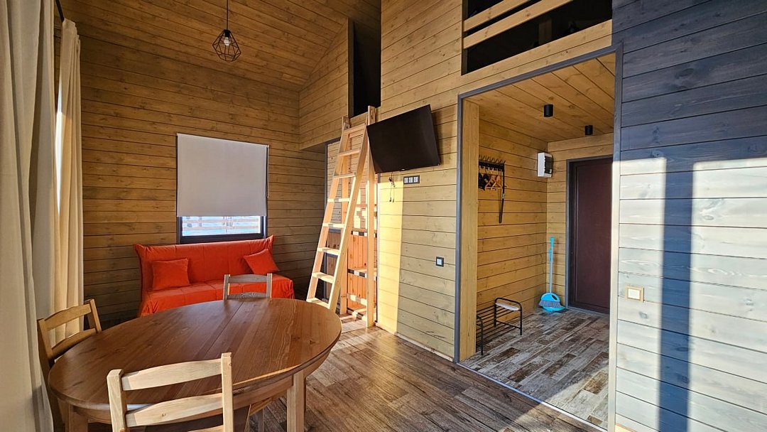 Домик со всеми удобствами и уютной террасой с видом на горы. Просторная гостиная с панорамными окнами, совмещенная с кухонной зоной. Современный санузел с душевой кабиной. Спальня с большой двуспальной кроватью и мансардными окнами на крыше.Услуги и удобства