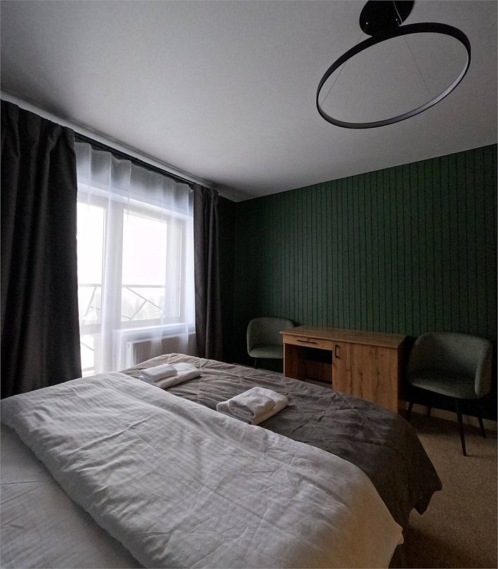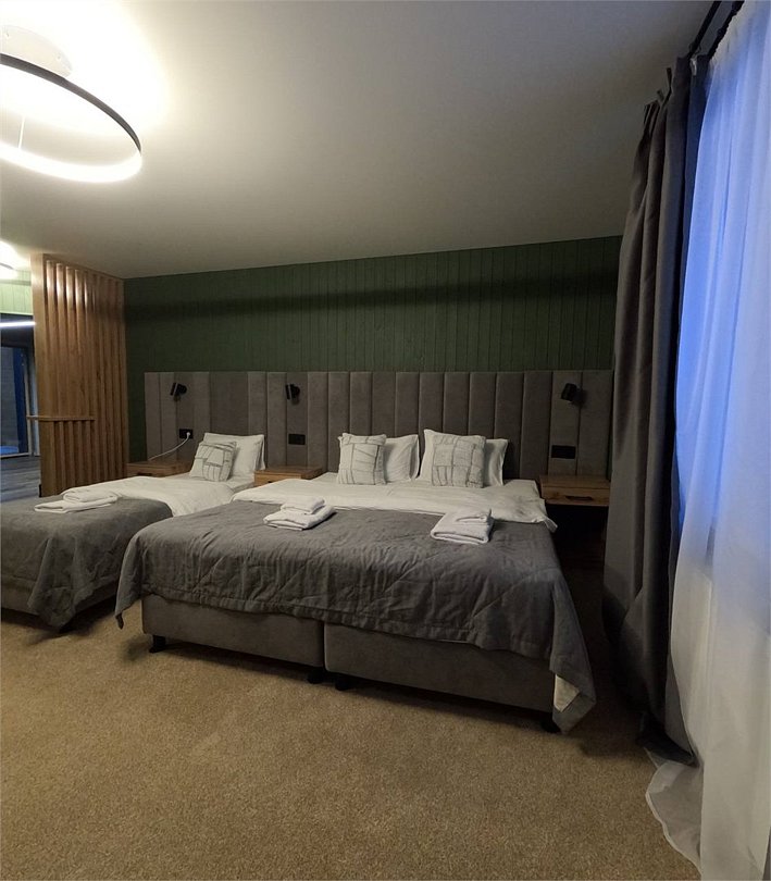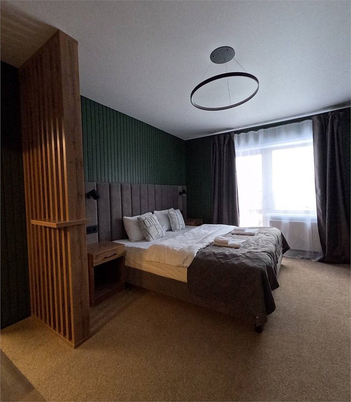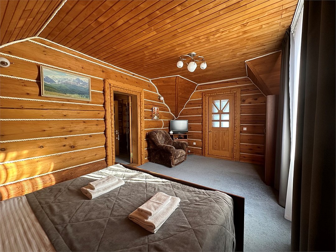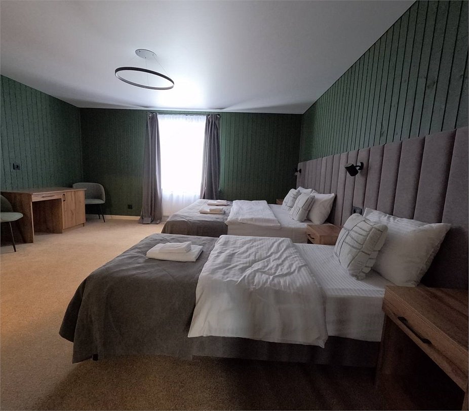 Номер расположен в основном корпусе гостиничного комплекса. Оформлен в современном стеле, выдержан в корпоративной цветовой гамме. Номер с видом на горы и лес, предназначен для проживания трех гостей.