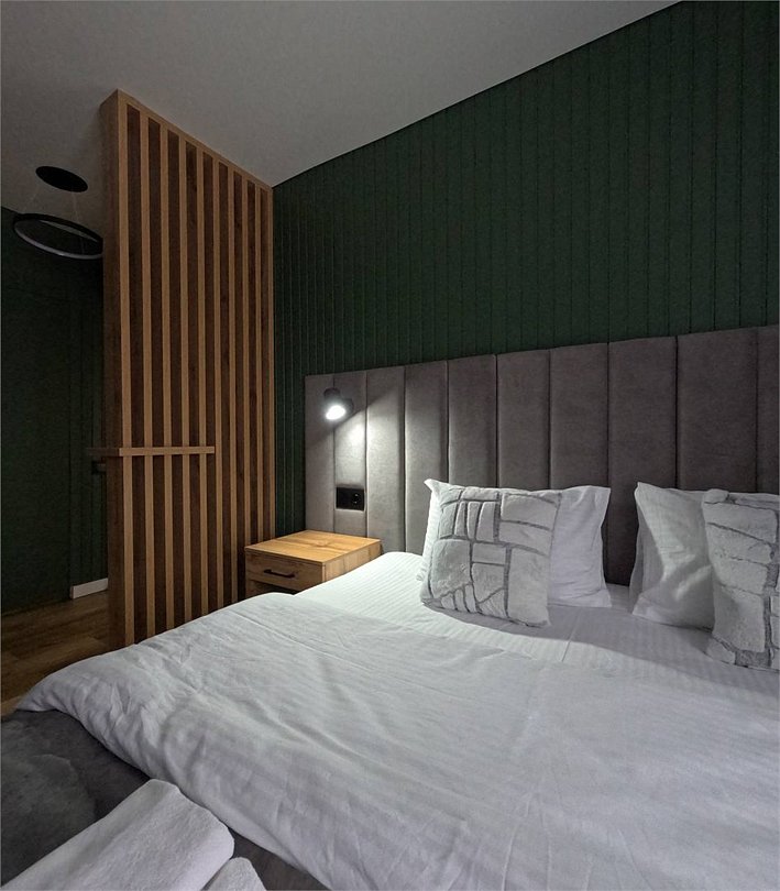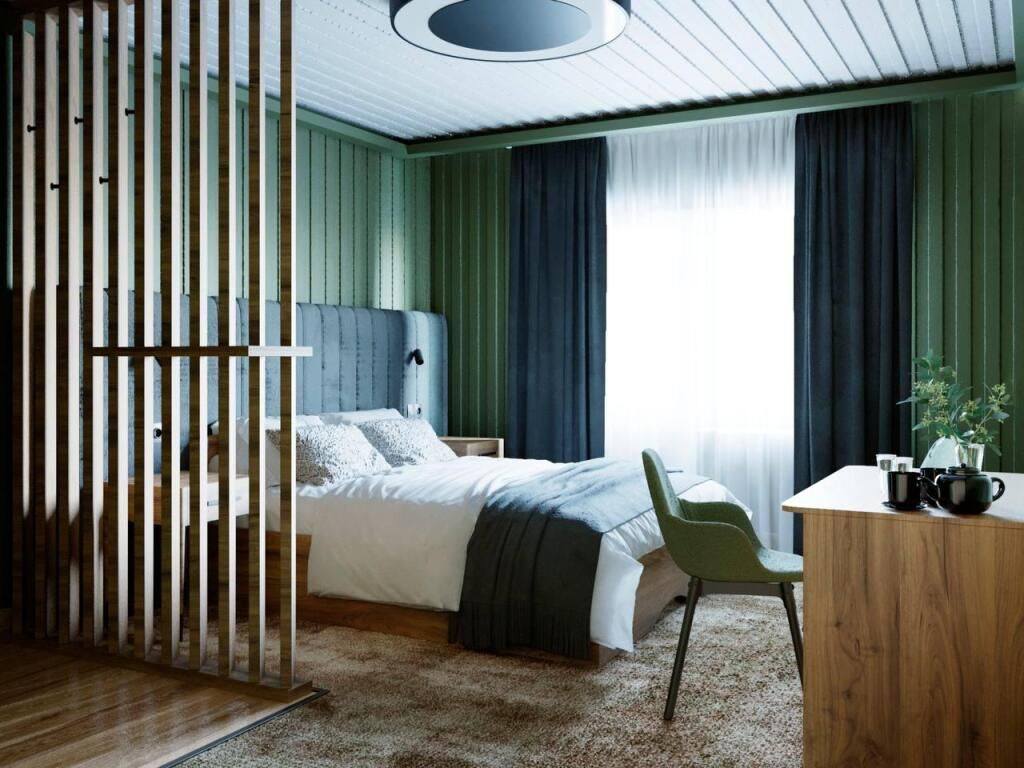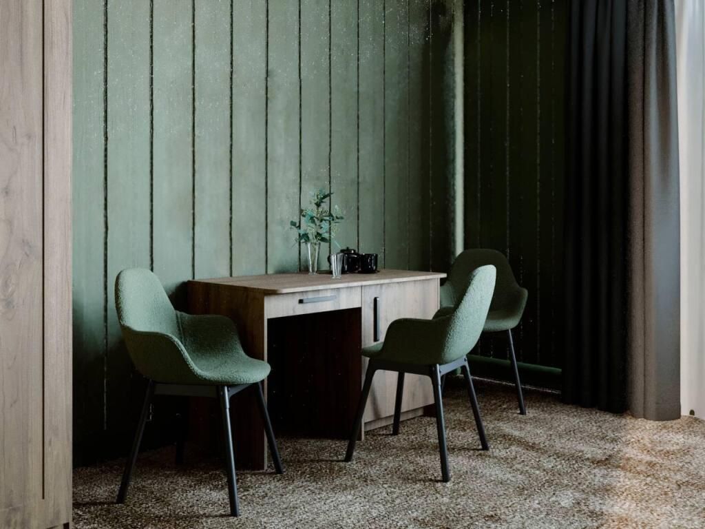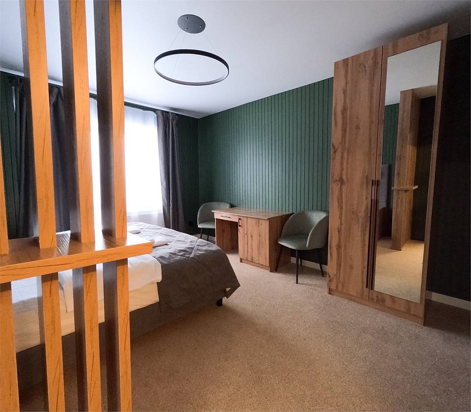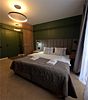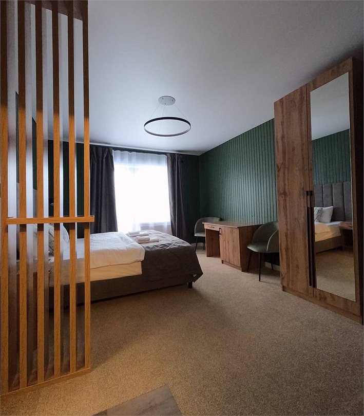 Номер расположен в основном корпусе гостиничного комплекса. Оформлен в современном стеле, выдержан в корпоративной цветовой гамме. Номер с видом на горы и лес, предназначен для проживания трех гостей.