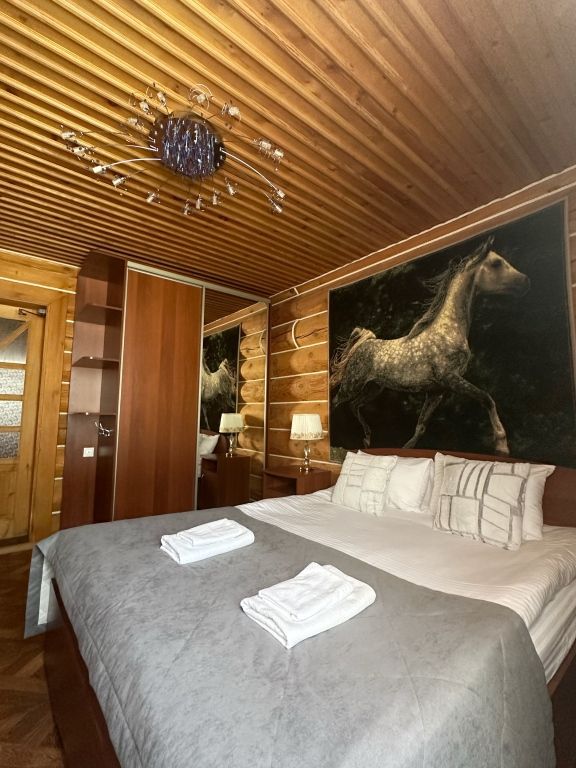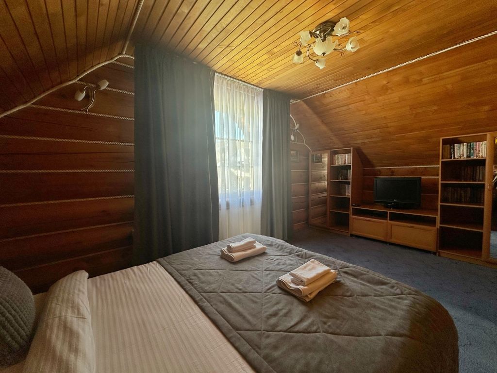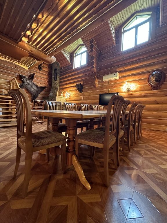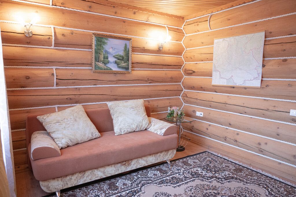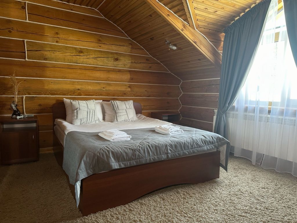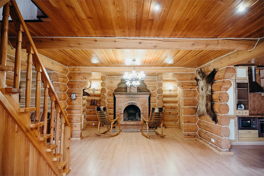 Двухэтажный коттедж «Викинг» оформлен в русском стиле, украшен шкурами диких животных, картинами, статуэтками ручной работы. Коттедж с видом на горы, лес и территорию туристического комплекса.