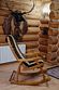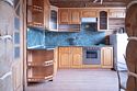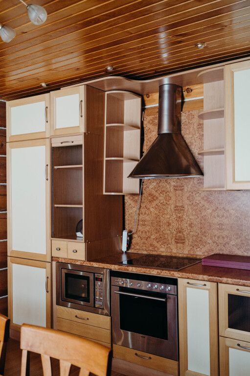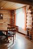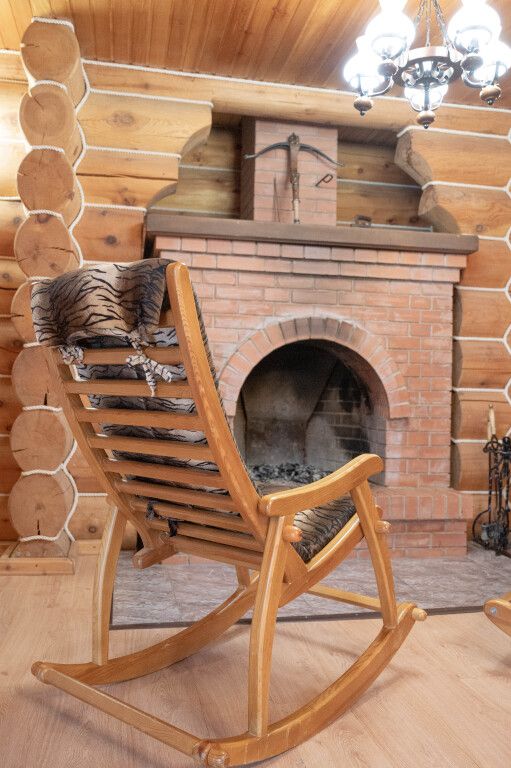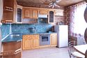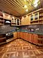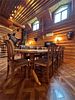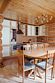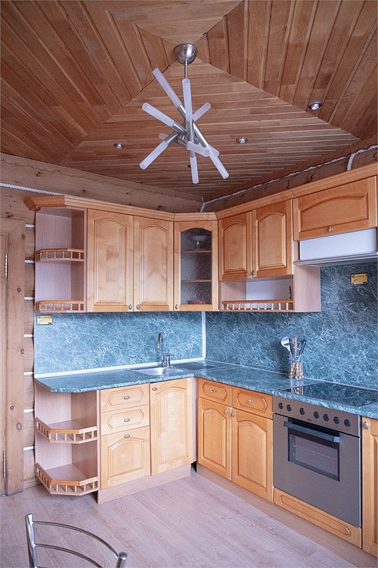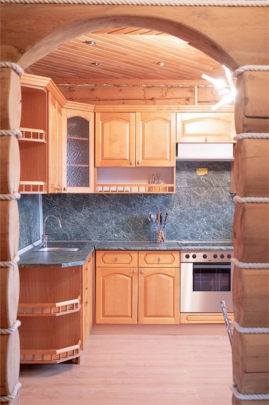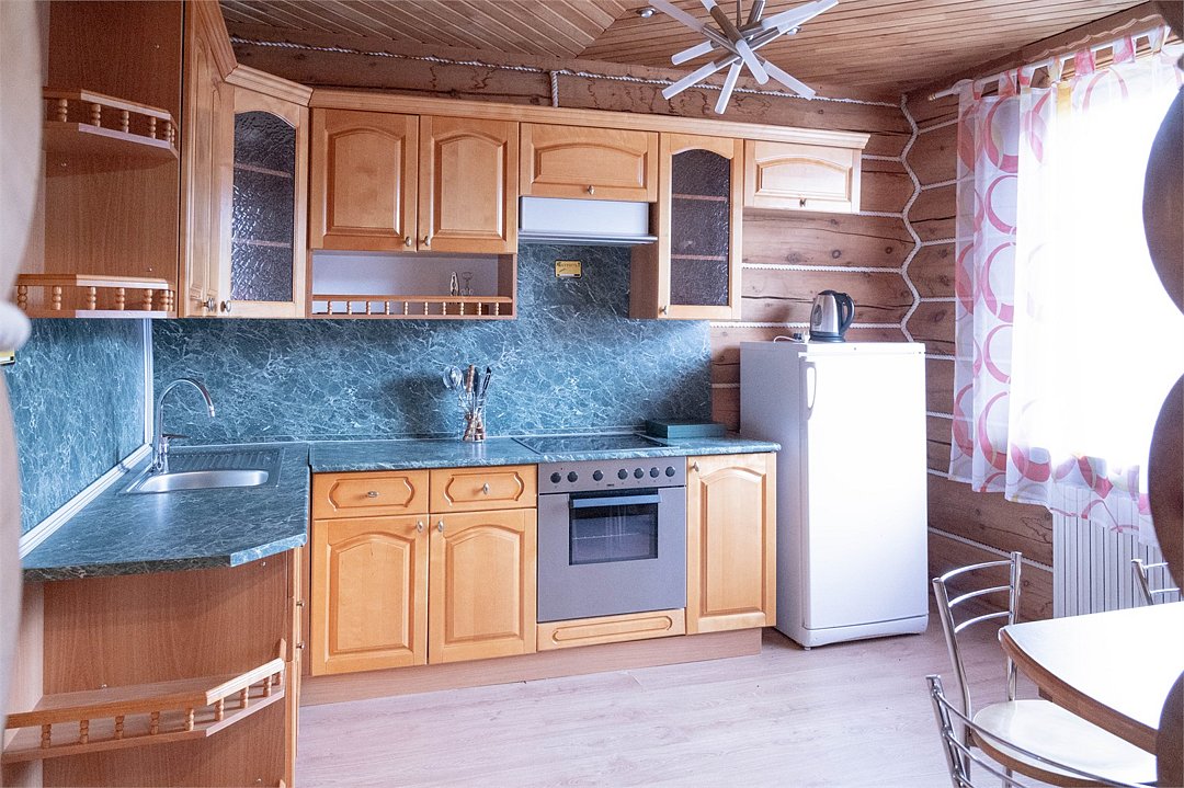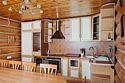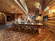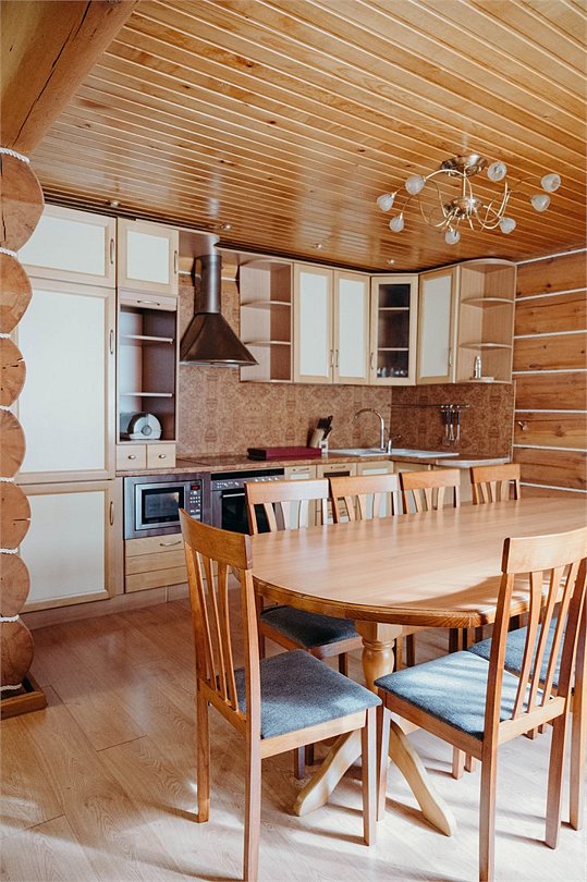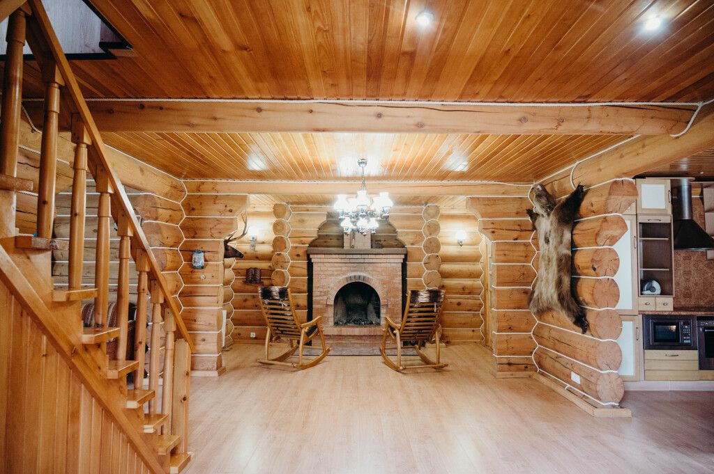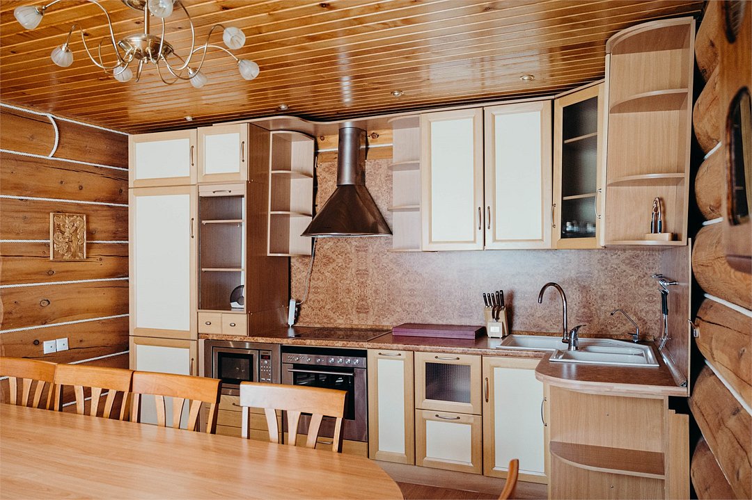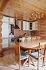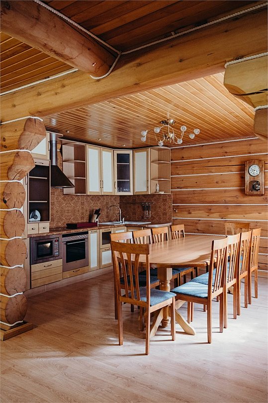 Гостиная: кресла у камина, журнальный столик, кабельное TV, обеденный стол, стулья, охотничьи трофеи. Кухонная зона: кухонный гарнитур, СВЧ-печь, духовой шкаф, электрический чайник, заварочный чайник, двухкамерный холодильник, набор посуды, мойка, консервный нож, штопор.