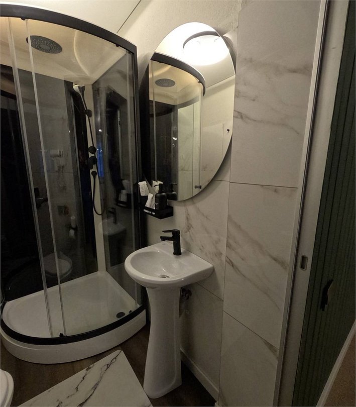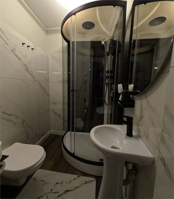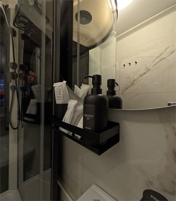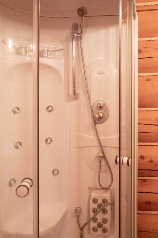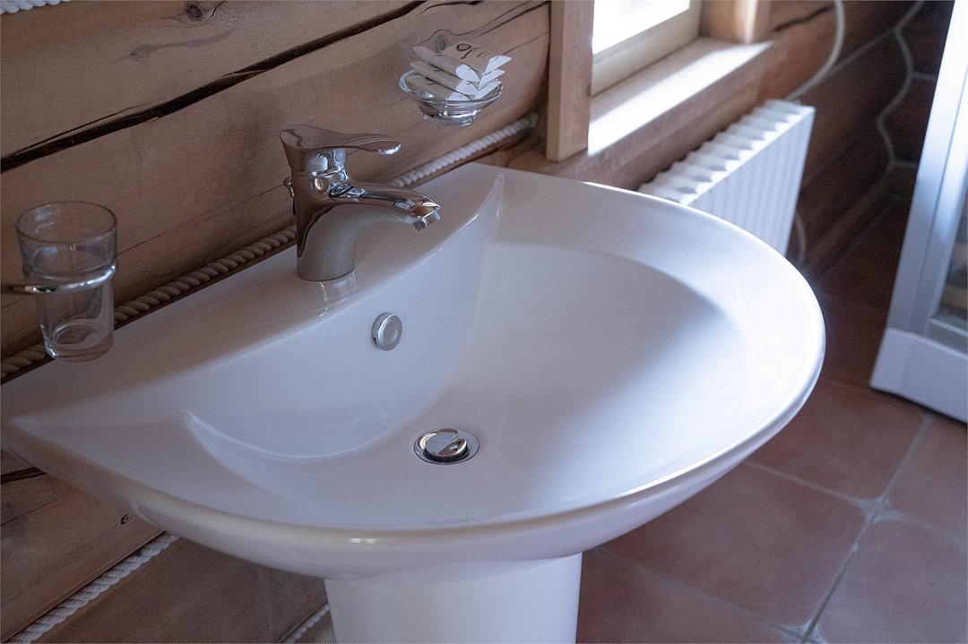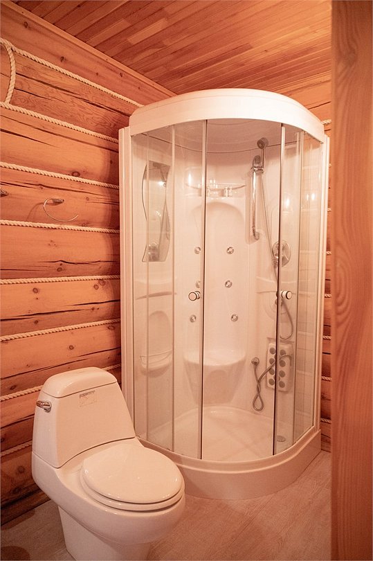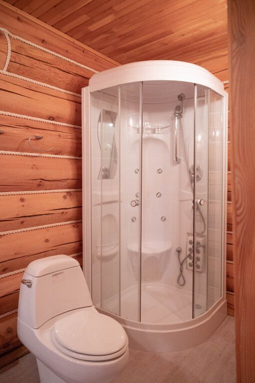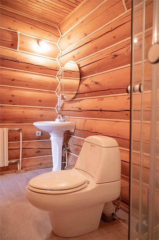 Санузел на первом этаже с умывальником, с душевой кабиной, набор полотенец, индивидуальные гигиенические наборы (мыло, шампунь, гель для душа, шапочка для душа, зубная щетка, зубная паста).