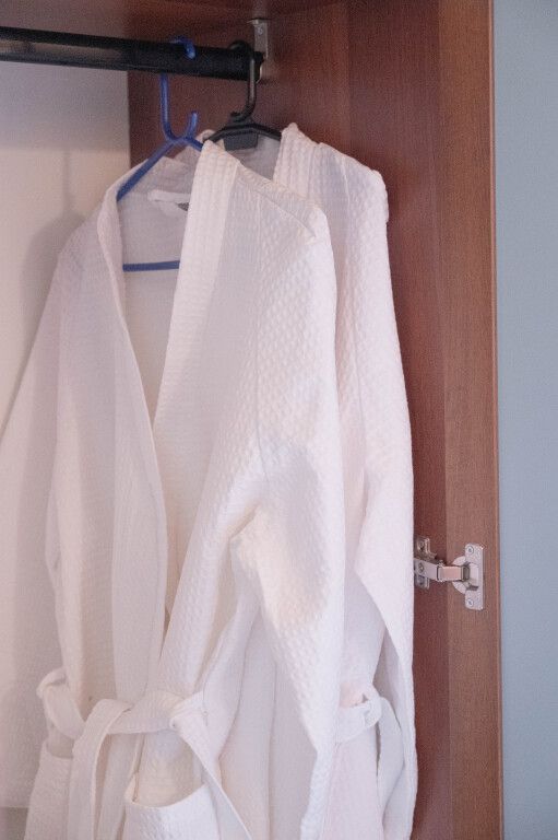 Спальня на первом этаже: двуспальная кровать, прикроватные тумбочки, шкаф и вешалка для одежды, бра, 2 халата, кресло, кабельное TV.