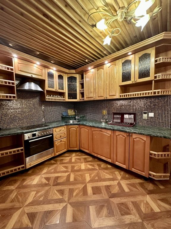 Кухонная зона: обеденный стол, стулья, кухонный гарнитур, холодильник, плита, набор посуды, мойка, вытяжка, электрический чайник, заварочный чайник, чайный сервиз, консервный нож, штопор.