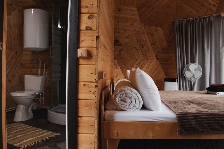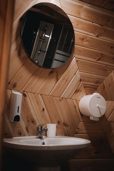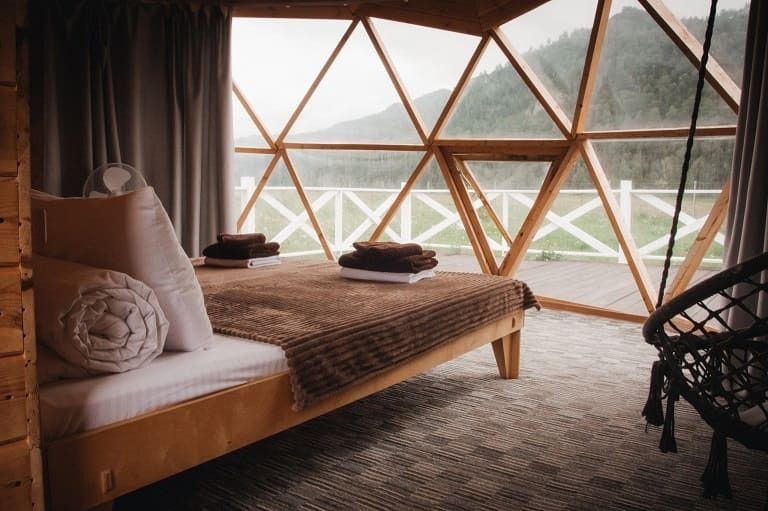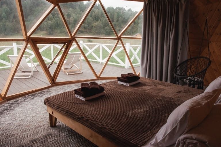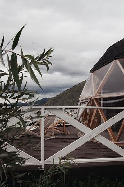 Проживание в деревянных купольных домах категорий «стандарт» и «комфорт», из которых открывается панорамный вид на горы. Перед окнами оборудована терраса с шезлонгами. Дома полностью обустроены для того, чтобы проживание было комфортным.