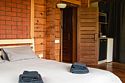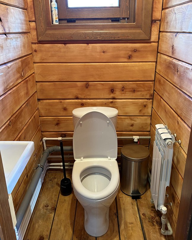 Инфраструктура: бассейн, купель, зона отдыха, полотенца, простыниНа территории шале «Рыжий кот», где находится Дом на двоих, расположена также и традиционная русская баня из рубленного кедра, топимая дровами. В ней предусмотрена уютная парная с вениками, просторная зона отдыха на восемь человек, а также уличный бассейн и холодная купель.