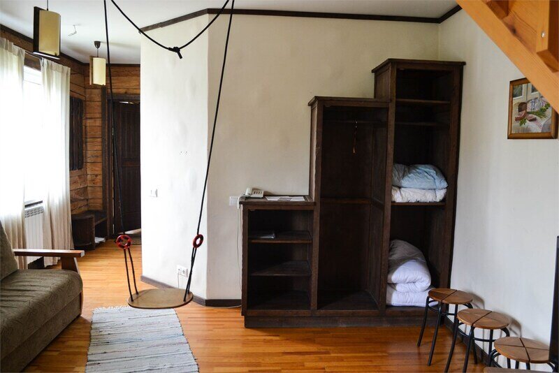 Туалетная комната (на каждом этаже). Качели и сауна (на первом этаже).