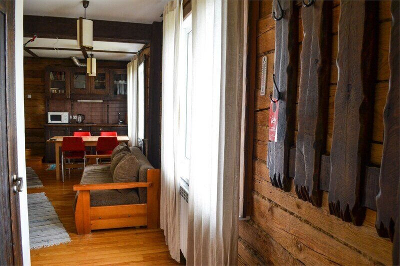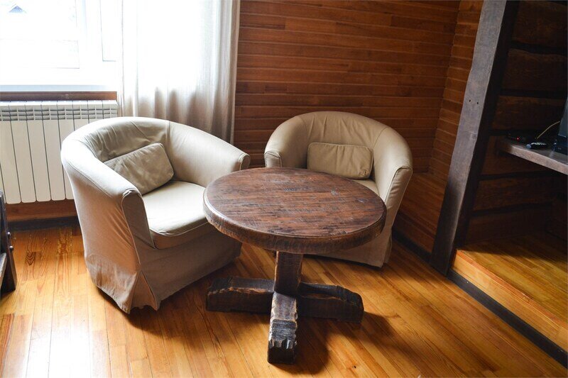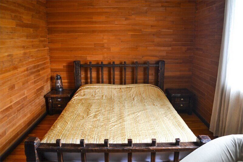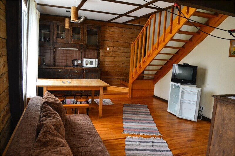 На втором этаже: двуспальная кровать, шкаф, прикроватные тумбы, журнальный столик, кресла, ТВ, телефон, фен, туалетная комната. Питаться можно как в ресторане гостиницы (возможно обслуживание в коттедже), так и самим, используя возможности кухни.