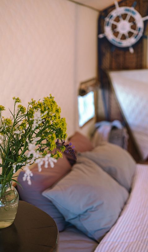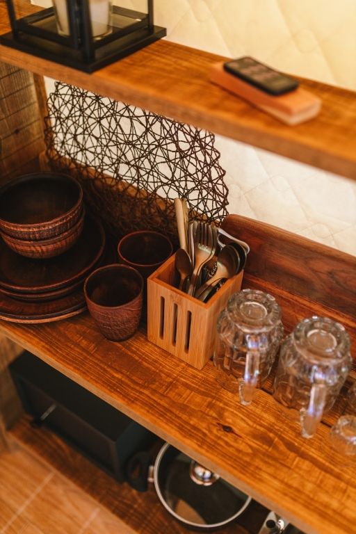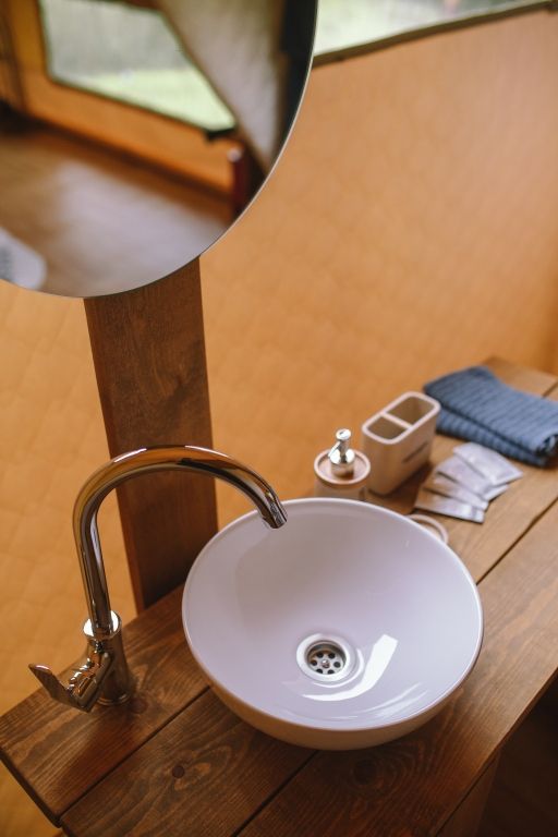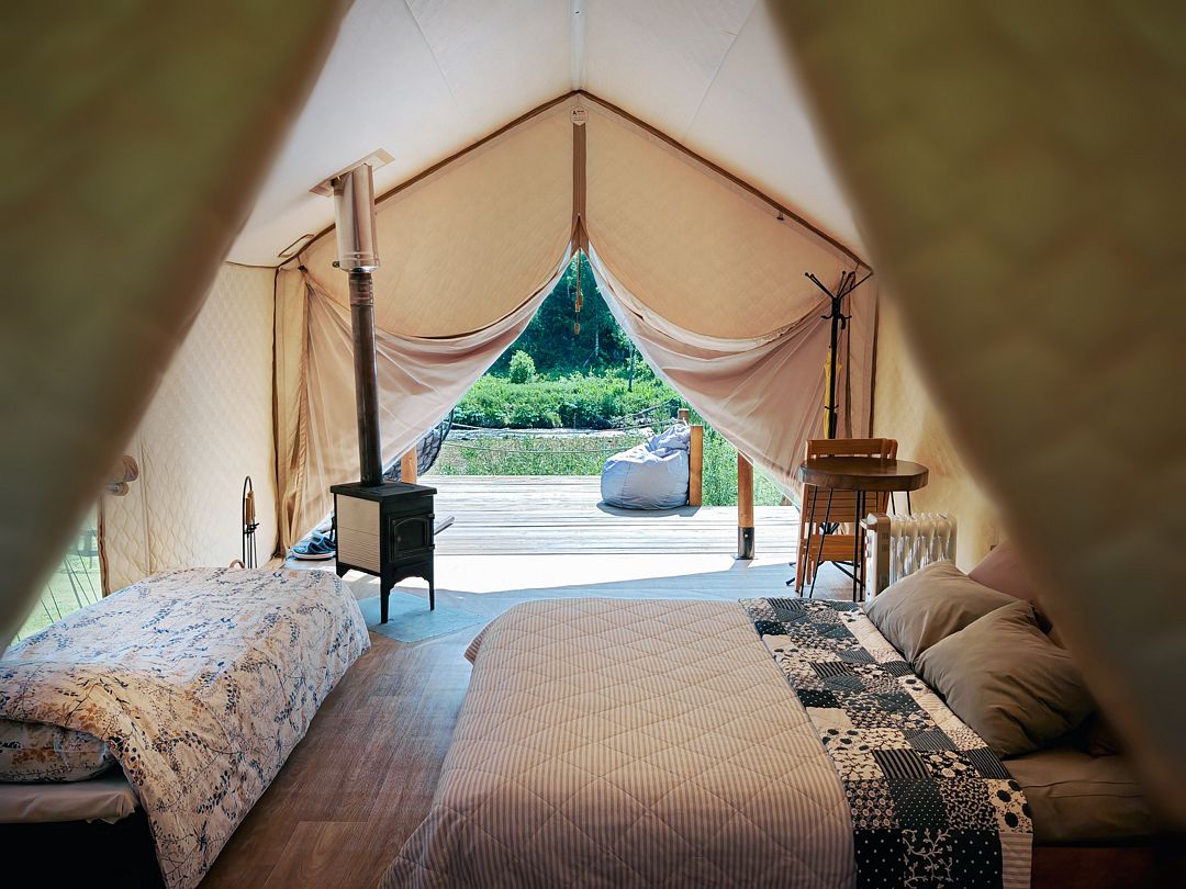 Шатер с удобной двуспальной кроватью, кухонной зоной и собственной ванной комнатой, оснащенной сантехникой, комплектом полотенец и халатов, а также гигиеническими средствами.