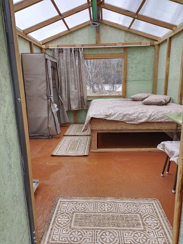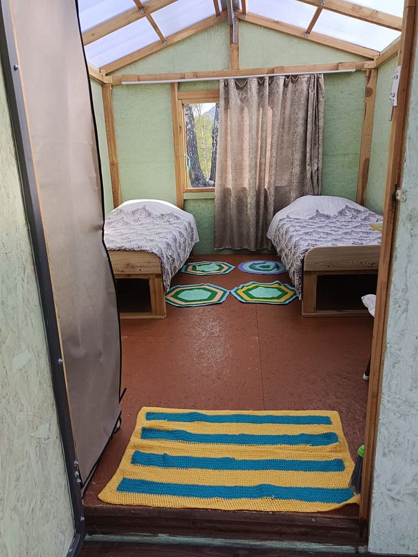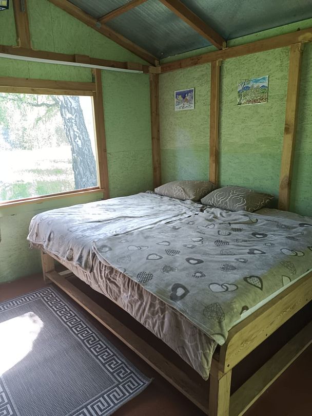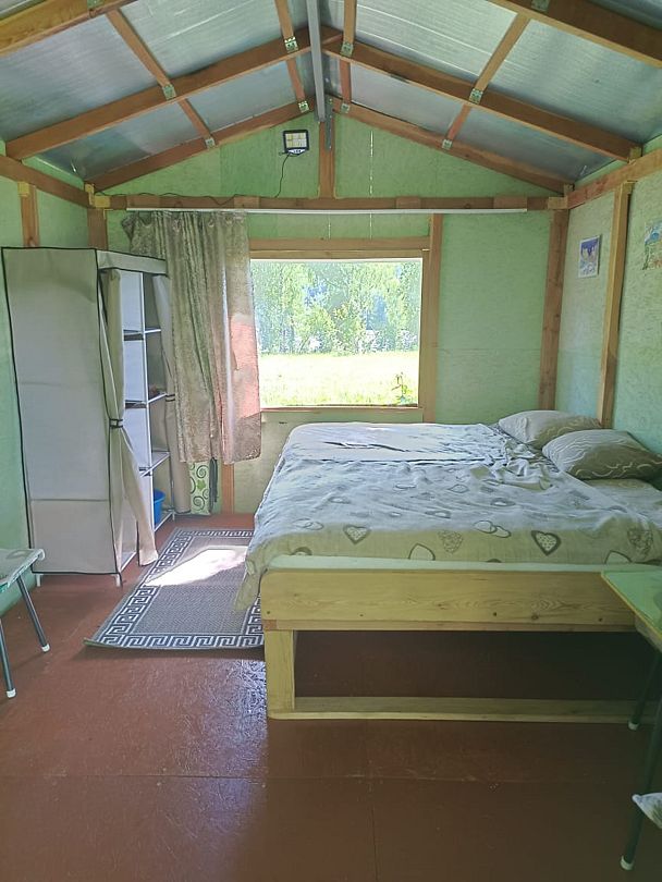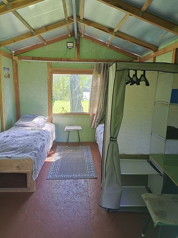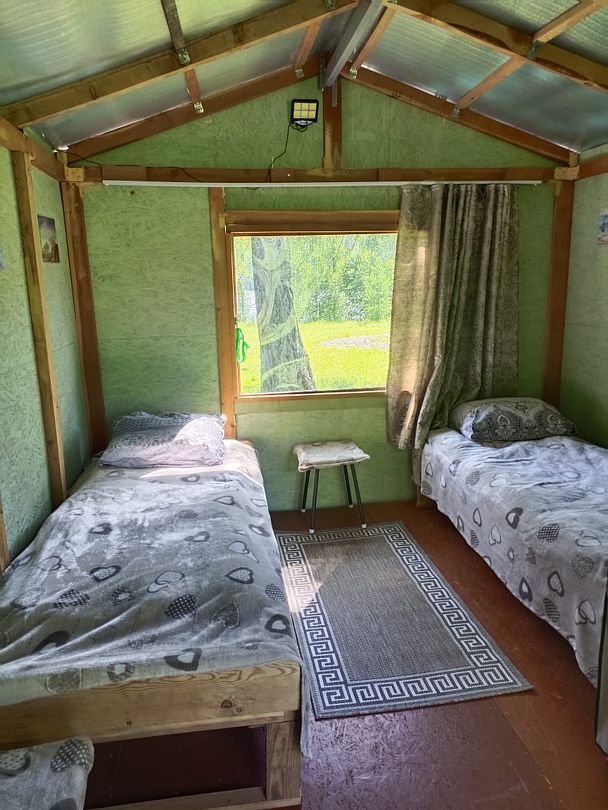 В домиках большое окно, материал домиков – деревянный брусок и крашеное ОСП. Кровати из дерева, с беспружинными матрацами, Полотенца, постельное бельё.