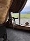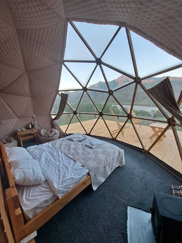 Домик отличается стильным дизайном и абсолютно новой обстановкой. Полностью стеклянная стена открывает захватывающий вид на горы, создавая ощущение полного погружения в природу. При этом, вы можете быть уверены в своей приватности – вас никто не увидит.