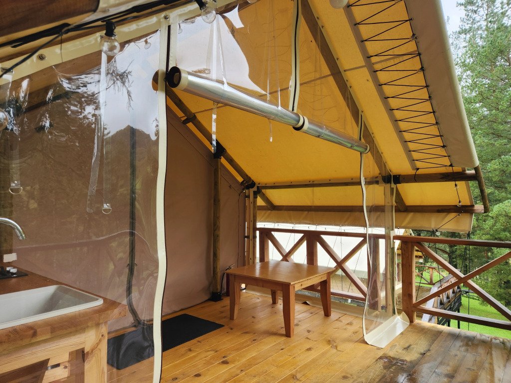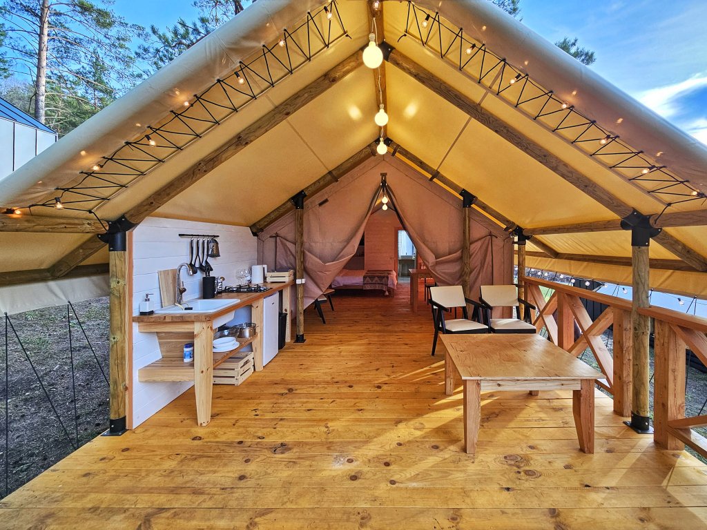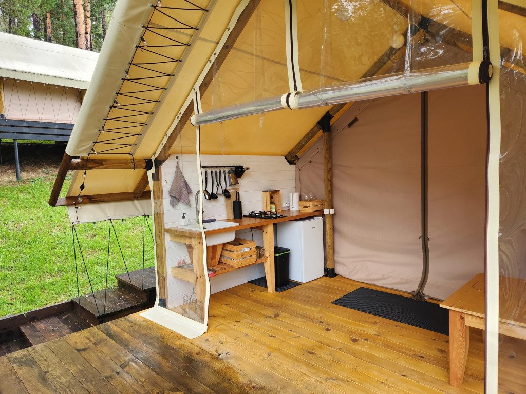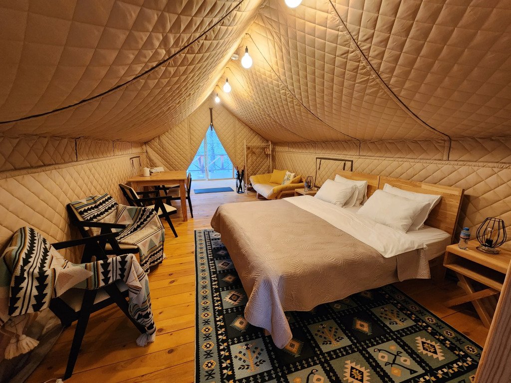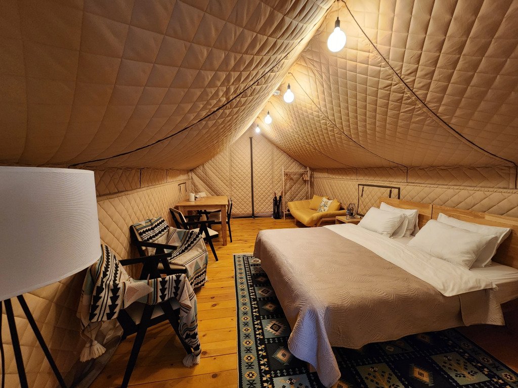 В отеле можно забронировать двухкомнатные апартаменты с панорамными окнами и сафари-тенты, предназначенные для сезонного проживания. В номерах имеется оборудованная кухня, собственный санузел с душевой кабиной и инсталляцией, тёплые полы, питьевая вода из скважины. Нет сотовой связи, но есть бесплатный Wi-Fi.