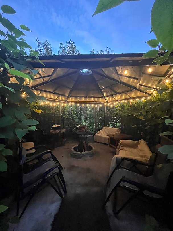 - А для любителей огня у нас есть костровище окружённое зеленой изгородью ,в котором можно развести огонь и, например пожарить зефирки и при этом любоваться всю ночь звездным небом.