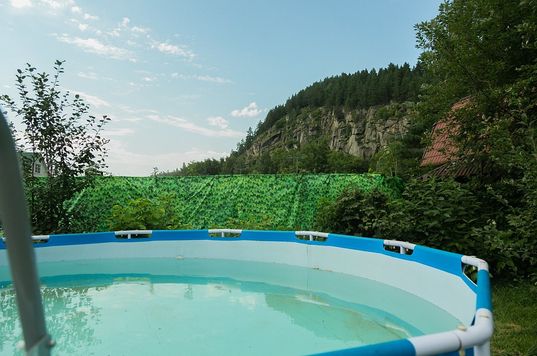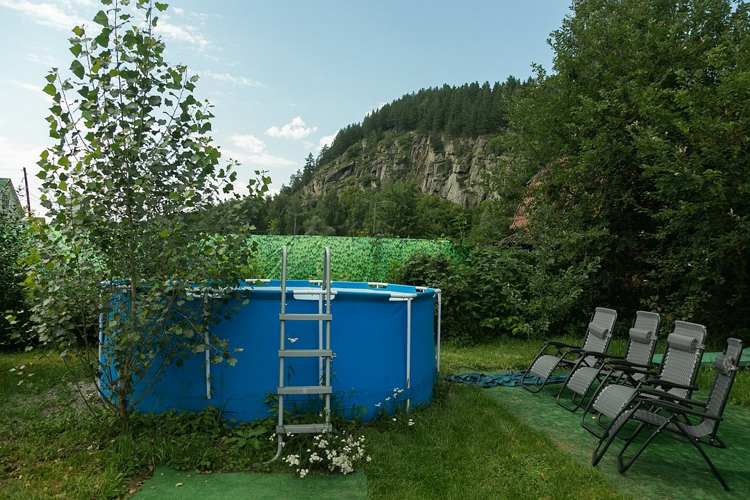 Тип бассейна: открытый бассейн, каркасный бассейнРядом с бассейном: шезлонгиСезонный бассейн с красивым видом на гору обеспечит возможность освежиться в жаркие дни или после посещения бани.Стоимость