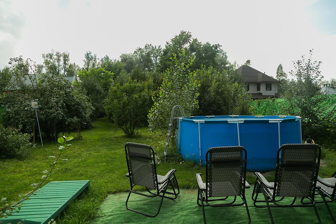 На территории оборудована парковка, мангал с принадлежностями для барбекю, баня и небольшой открытый бассейн, в котором могут купаться так взрослые, так и дети.