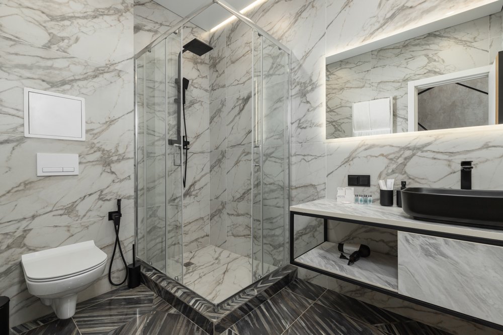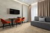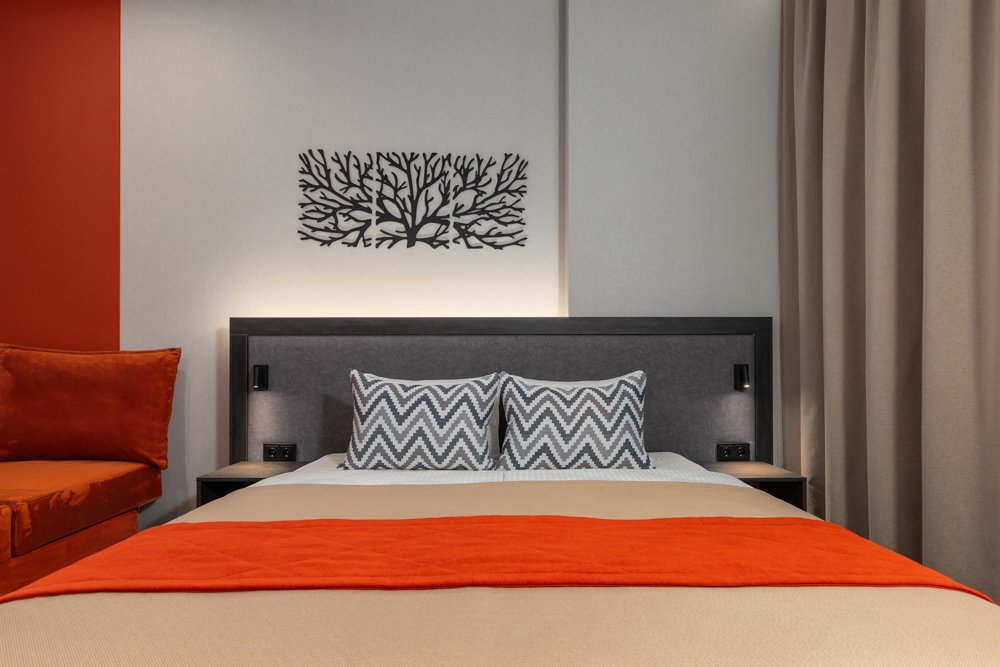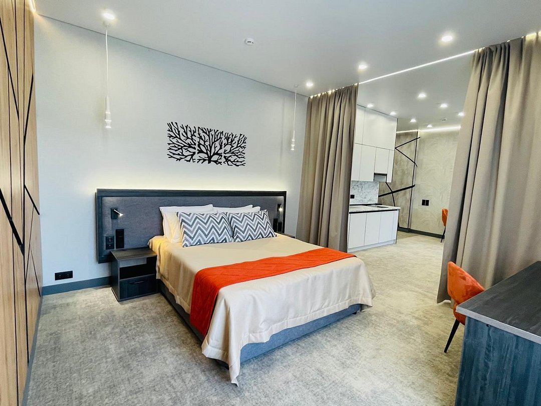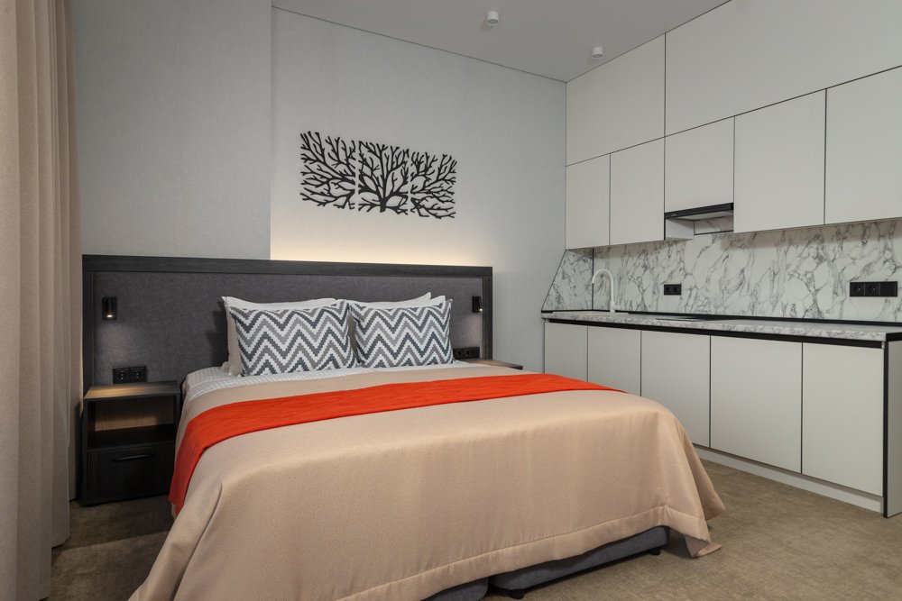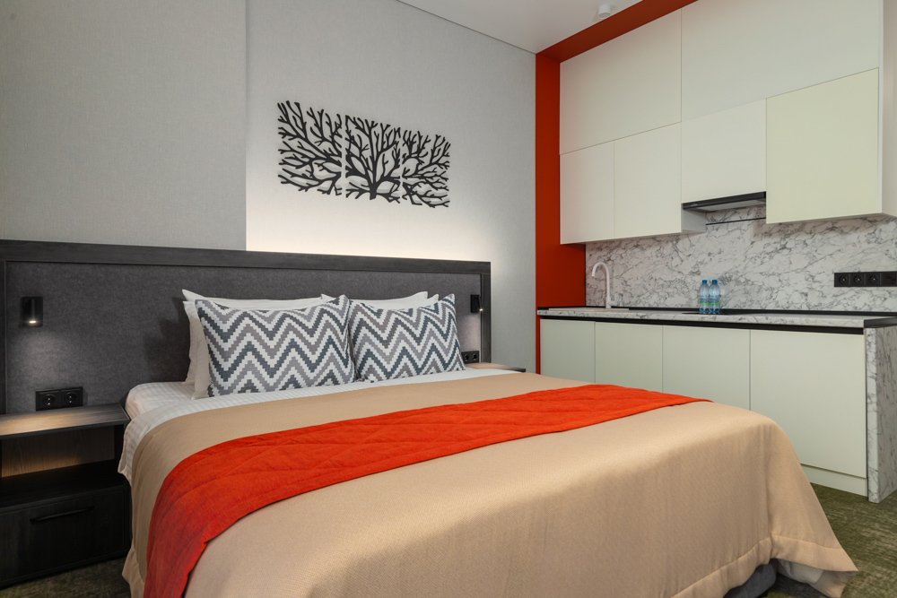 Номер с балконом состоит из спальни и гостиной, зонирован шторами блэкаут, рассчитан на проживание одного/двух гостей. Ванная комната в номере оборудована душевой кабиной.