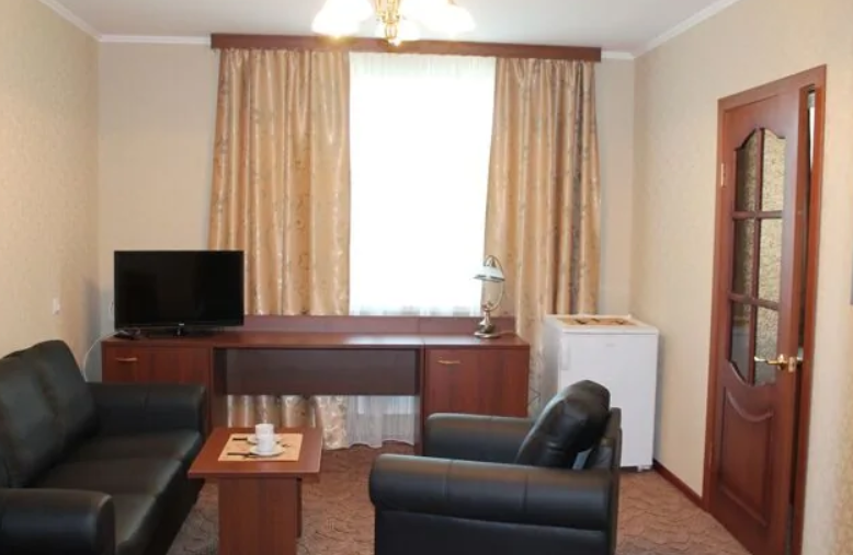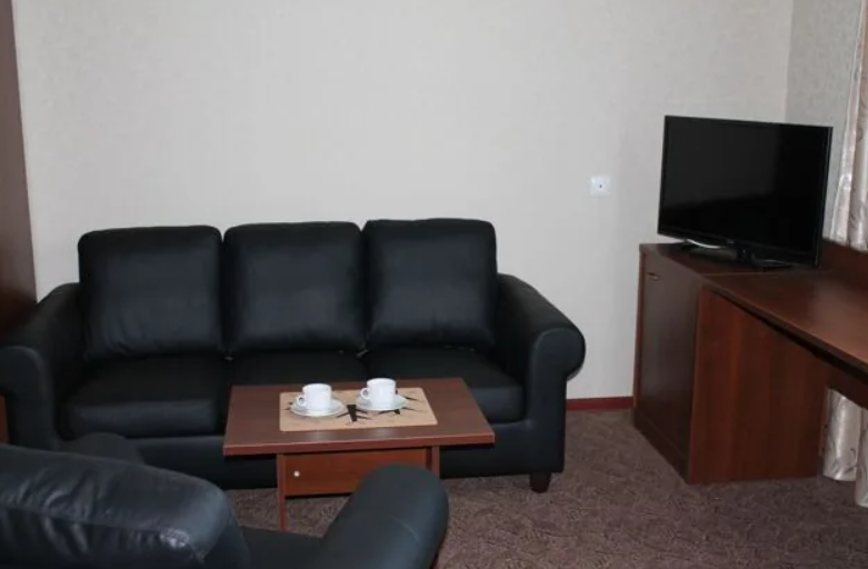 В номере две комнаты: гостиная и спальня, имеется балкон. В гостиной диван с телевизором. Собственная ванная комната.