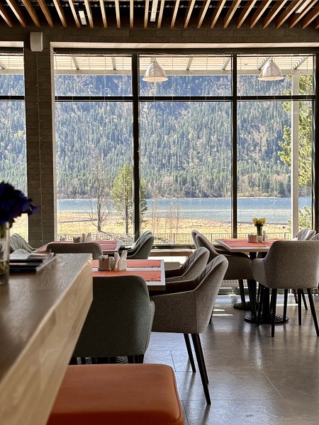 Просторный ресторан с панорамными окнами, мягкими креслами и очень внимательным персоналом.