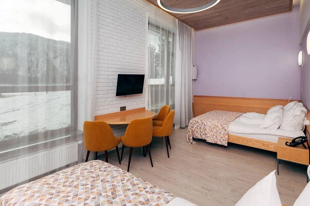 Wi-Fi, кондиционер, фен, электронные замки, утюг, душевая кабина, теплый пол, халаты, тапочки, гигиенические средства, косметические средства, две односпальные кровати, унитаз, раковина, душ, туалетные средства, внутренний телефон, мини-холодильник, вид на озеро, вид на горы, телевизор со Smart TV, мыло, можно с питомцамиВ гостиничном номере
