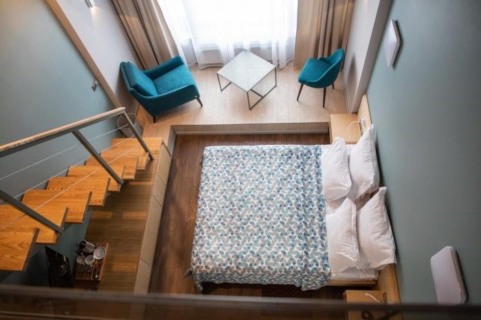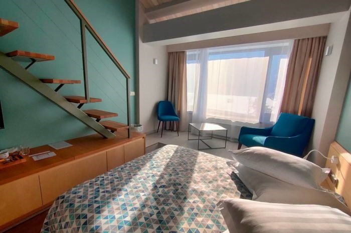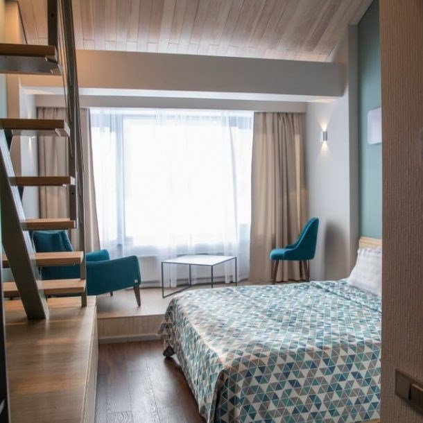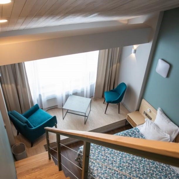 Просторный двухэтажный номер на третьем этаже гостиничного комплекса с видом на Телецкое озеро. Есть возможность дополнительного размещения (диван). Удобства номера: • мягкая кровать King Size (180 x 200) на первом этаже • раздвижной диван на втором этаже • белоснежное постельное бельё • место для хранения вещей • туалет и душ • косметика для душа • махровые халаты и полотенца, тапочки, фен • бесплатный Wi-Fi • холодильник и чайник • телевизор • питьевая вода • минимальный набор посуды • рабочий стол Важно: Мы рады приветствовать гостей с собаками мелких и средних пород весом до 10 кг. Заезд с животными возможен за дополнительную плату 3 000 р. за весь период проживания.Услуги и удобства