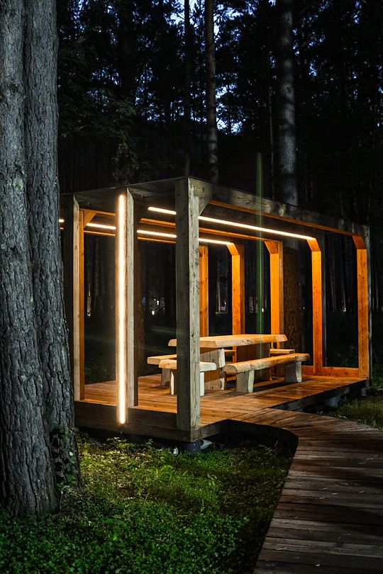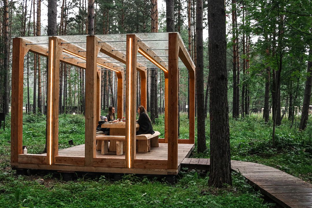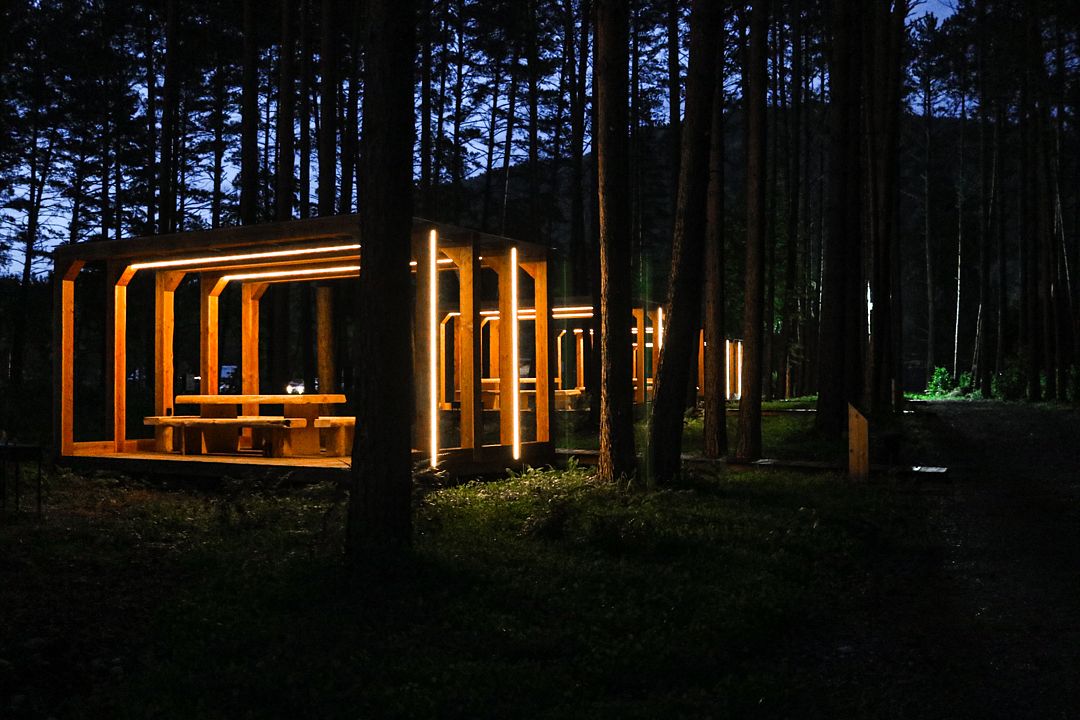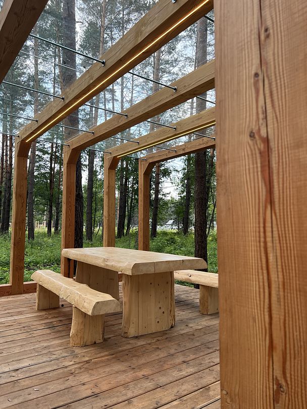 Беседки оснащены массивной деревянной мебелью, прозрачным навесом от дождя, мангалом, электричеством и освещением. Можно принести свой алкоголь и еду.Вместимость: 10−12 человек. Время посещения с 10:00 до 23:00.