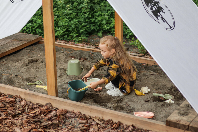Детская площадка в экостиле с домиком на дереве и качелями.