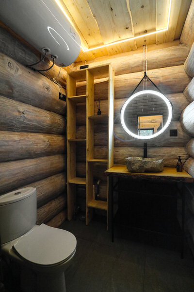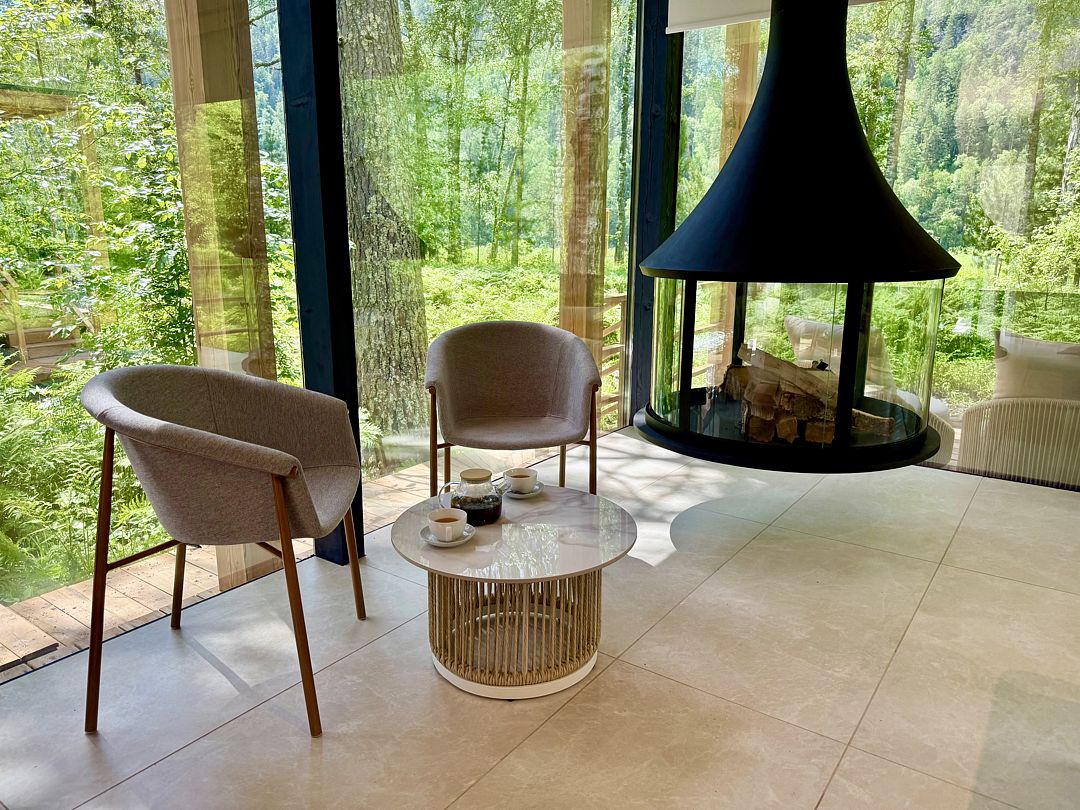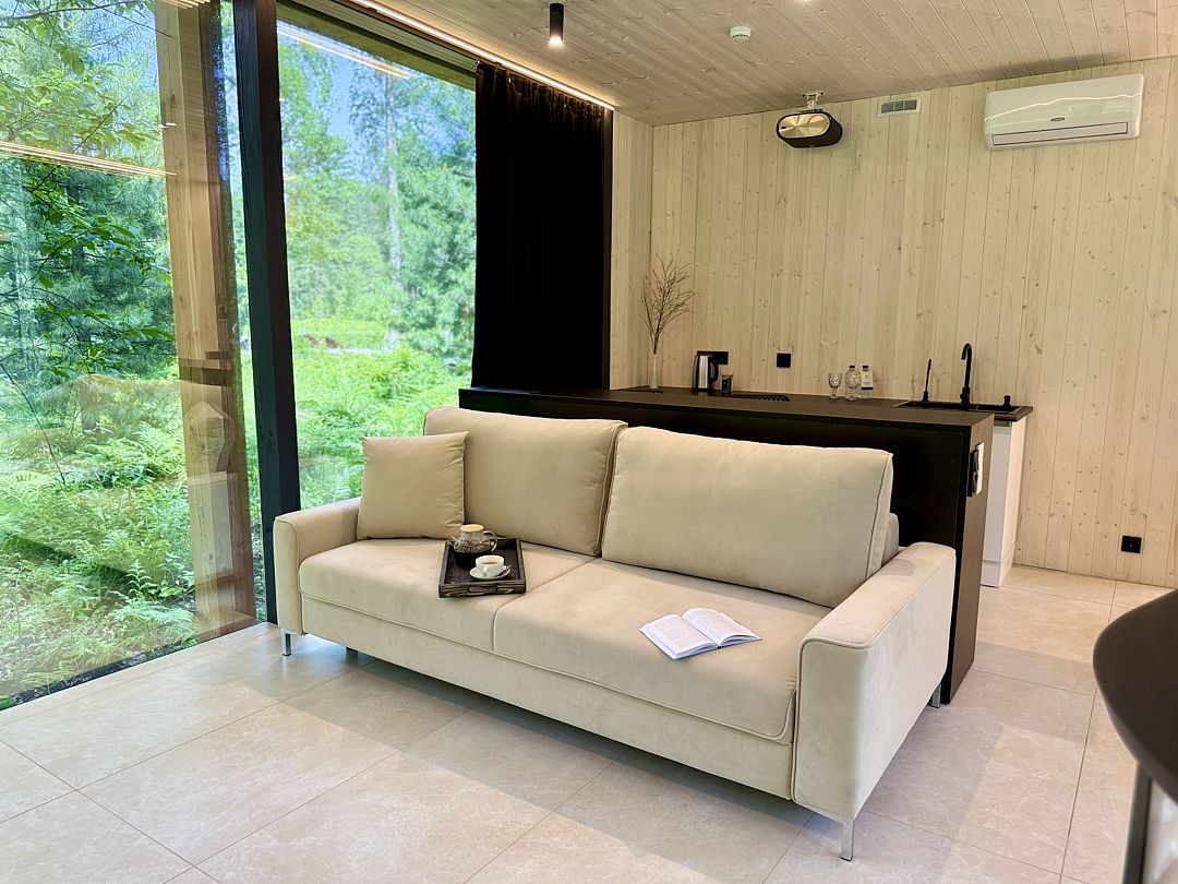 Дом с панорамным потолком и стенами погружает вас в атмосферу природы, не выходя из уюта. Идеален для романтического уикенда или отдыха вдвоем — с камином, ванной прямо в комнате и проектором вместо телевизора. Терраса с дизайнерской мебелью и собственная кухонная зона с барной стойкой делают этот дом по-настоящему особенным.