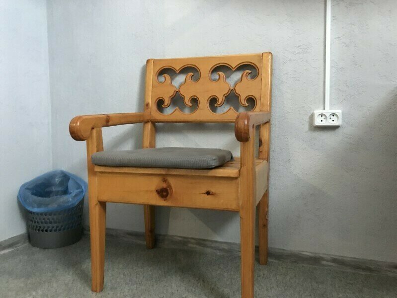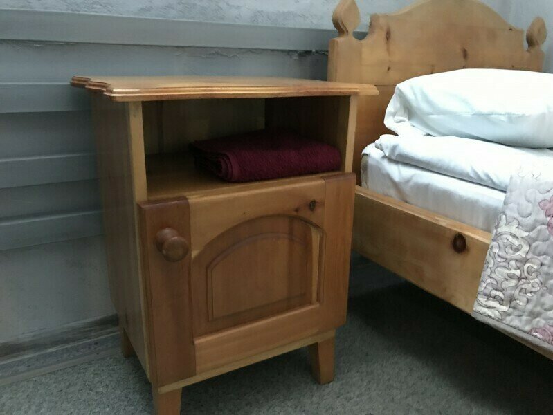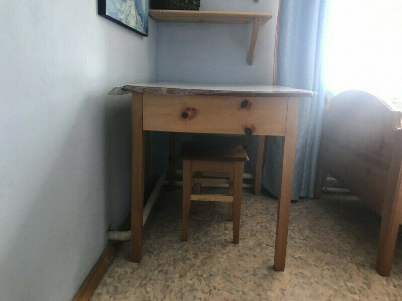 Усть-Кокса. Трехместный номер класса эконом расположен на втором этаже гостевого дома. В комнате три кедровые кровати, белое белье, полотенца. Тумбочка и полки для одежды, стол. Туалет рядом с комнатой. В других комнатах на этаже есть свои туалеты. Душ на первом этаже. Стены украшены картинами американской художницы К. Хилтон. Можно воспользоваться общей кухней или заказать питание.