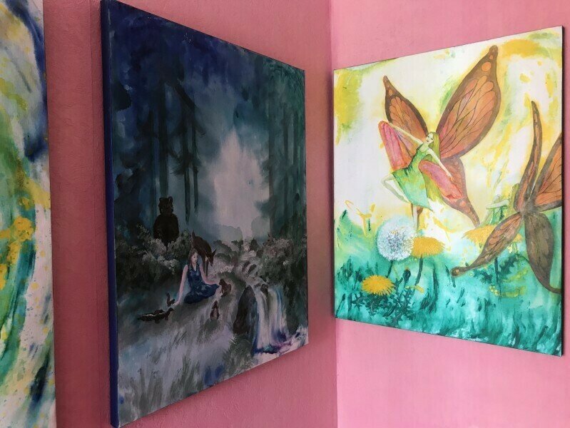 Комната украшена картинами американской художницы Кэрол Хилтнер.