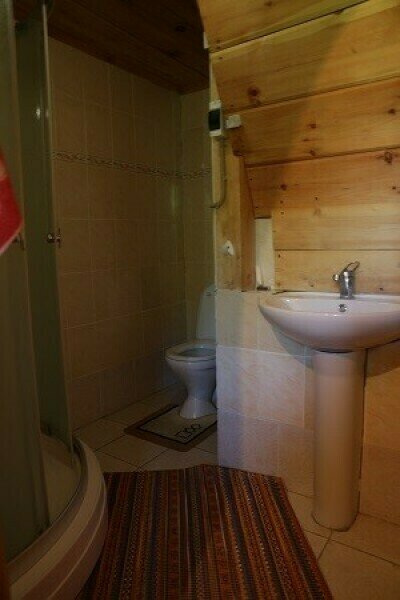 Трехместный экономный номер расположен на втором этаже кедрового дома. В комнате три кедровые односпальные кровати, белое белье, полотенца. Стол, шкаф для одежды. На этаже туалет, душевая кабина. Кухня и баня недалеко от кедрового дома. Во дворе также уличные туалеты, раковины.