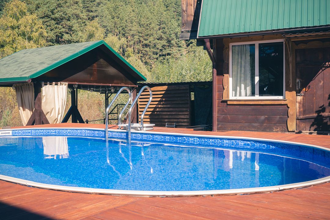 Рядом с баней расположен бассейн и также протекает прохладная горная река.