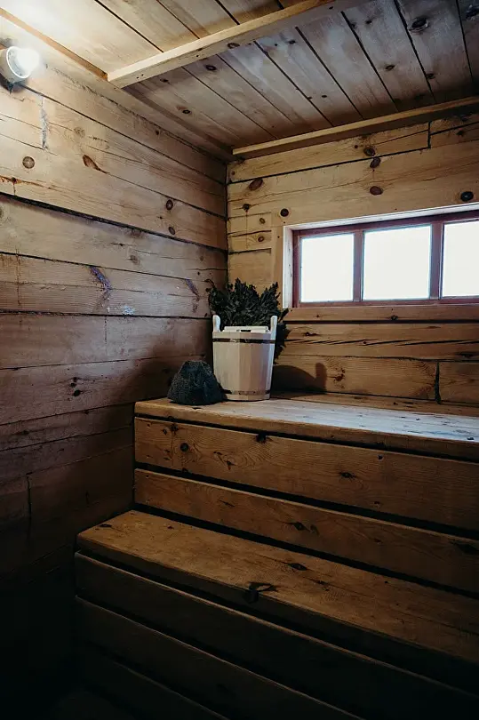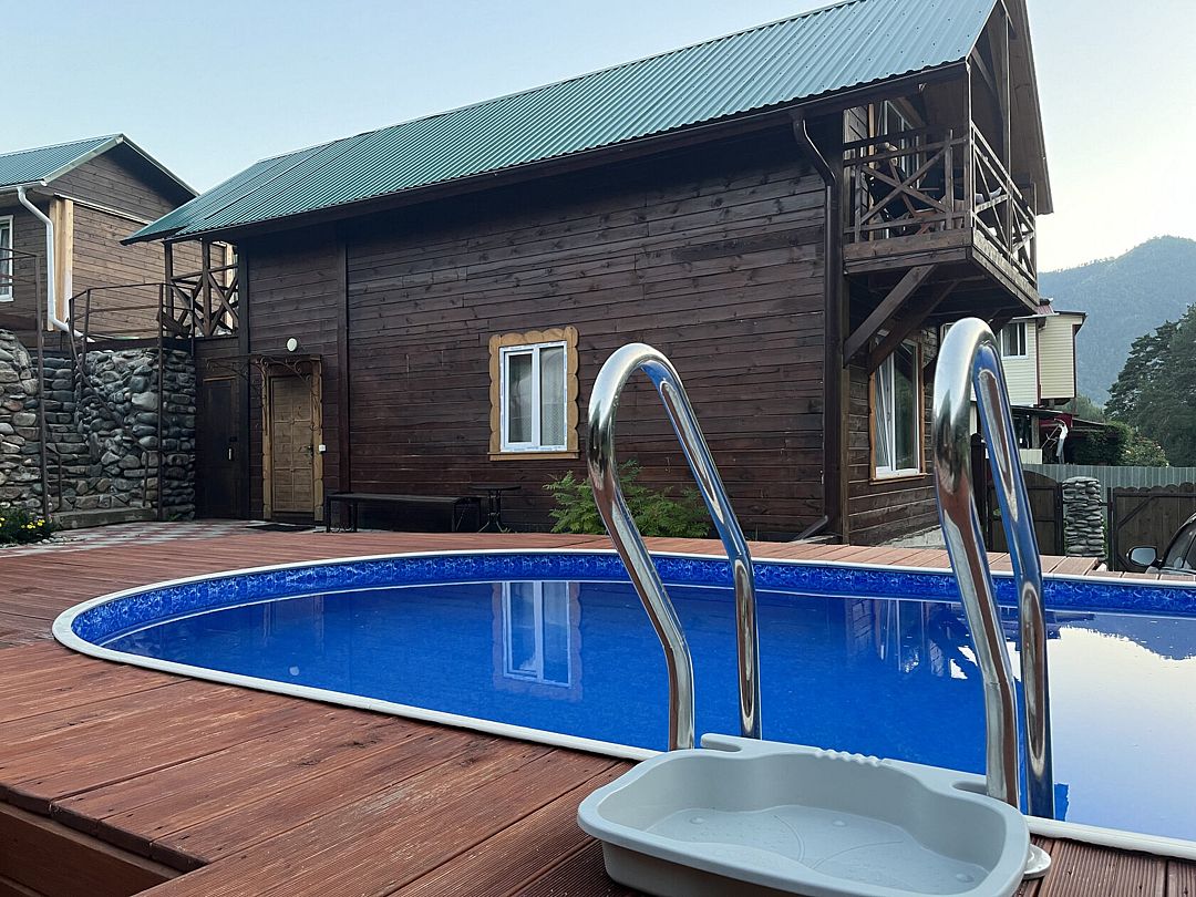 Отличная баня из массива кедра, в бане можно пользоваться вениками и эфирными маслами, рядом с баней расположен бассейн и холодная горная река.
