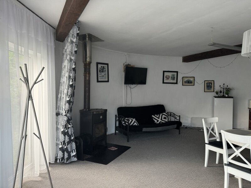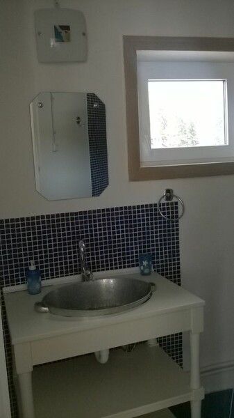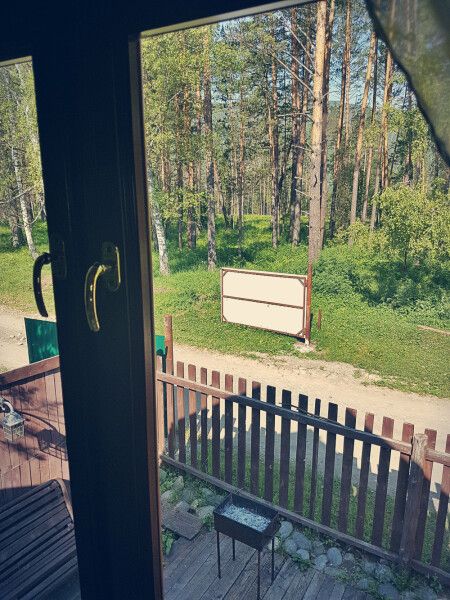 Уединенный дом с большой террасой и выходом в лес, мангал, стол с лавками. Две двуспальные кровати и две односпальные. Шесть основных мест.