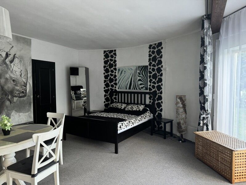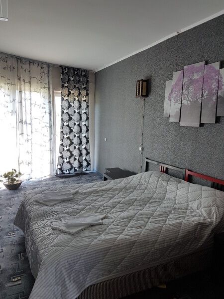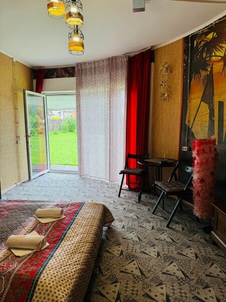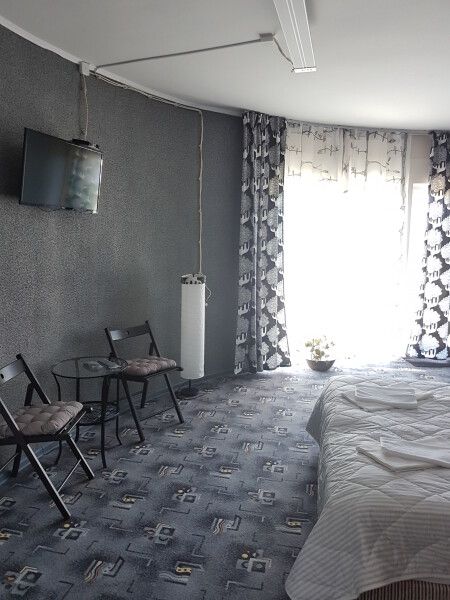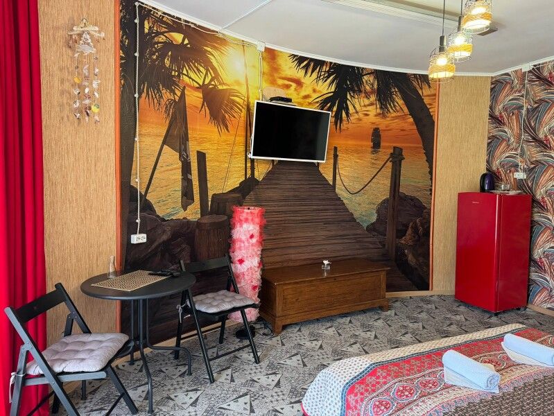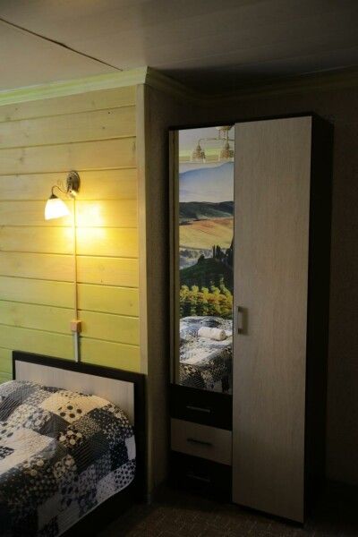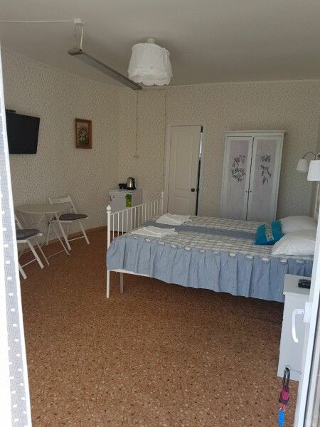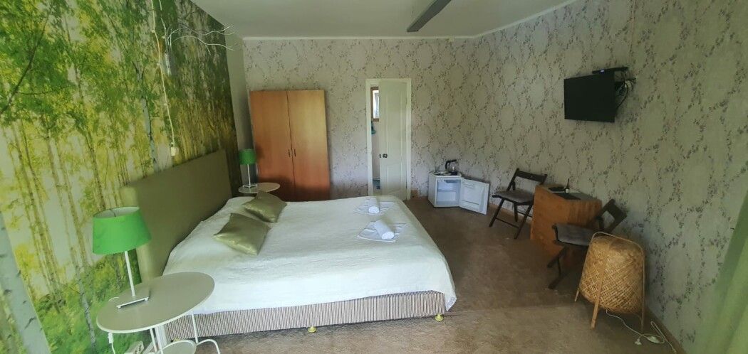 Круглый дом на два отдельных номера. Двуспальная кровать, два основных места плюс одно дополнительное, тумбочки, шкаф, ТВ, холодильник, чайник, набор посуды, стол.