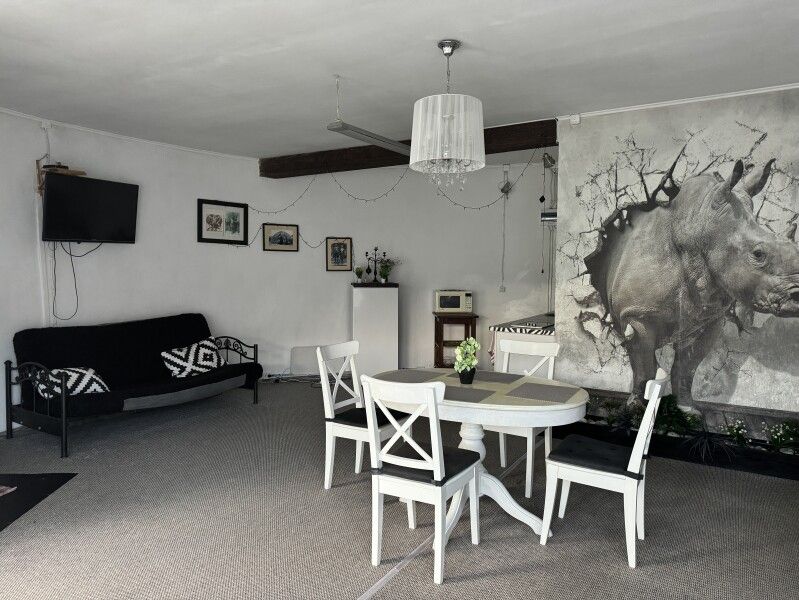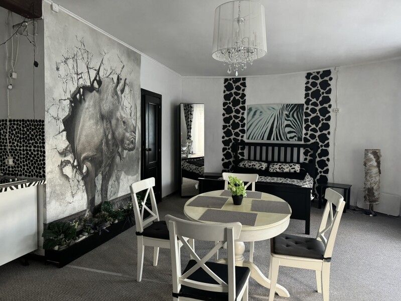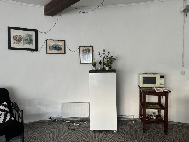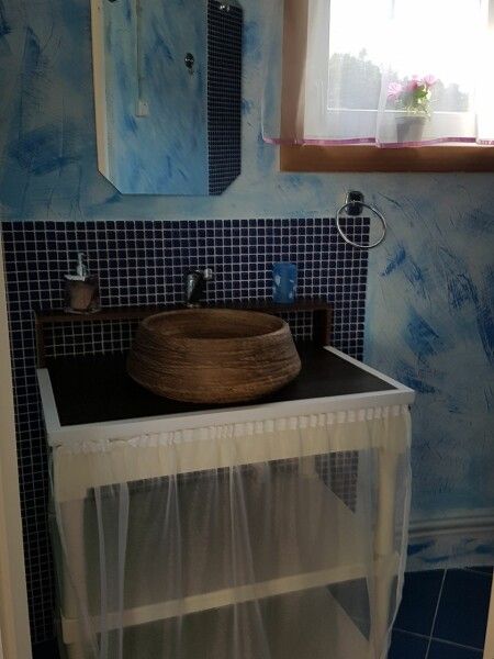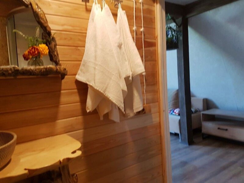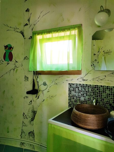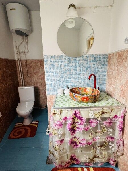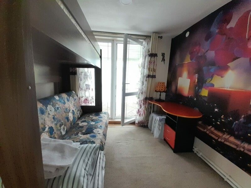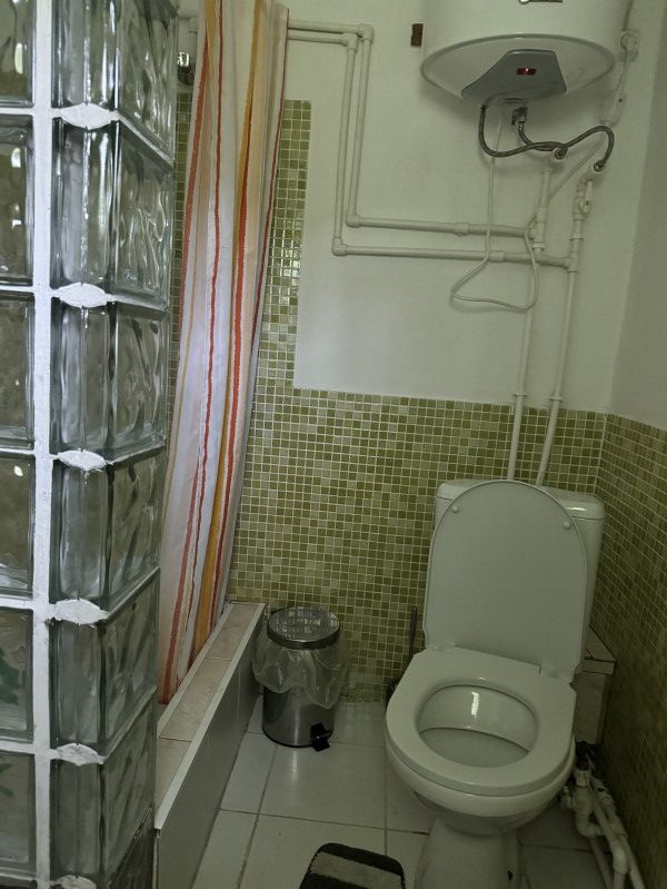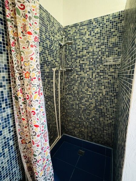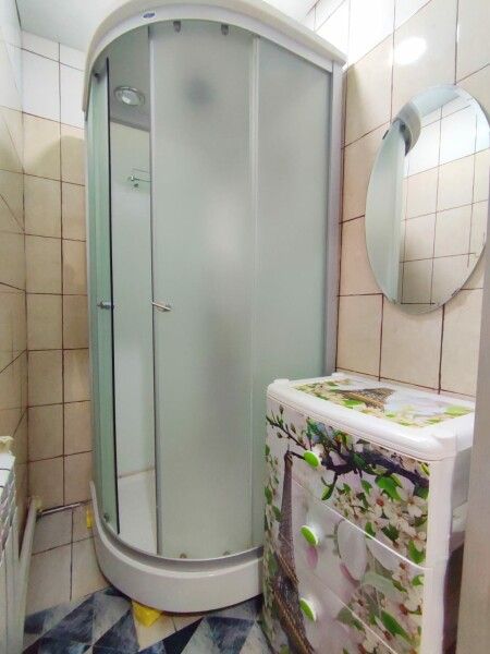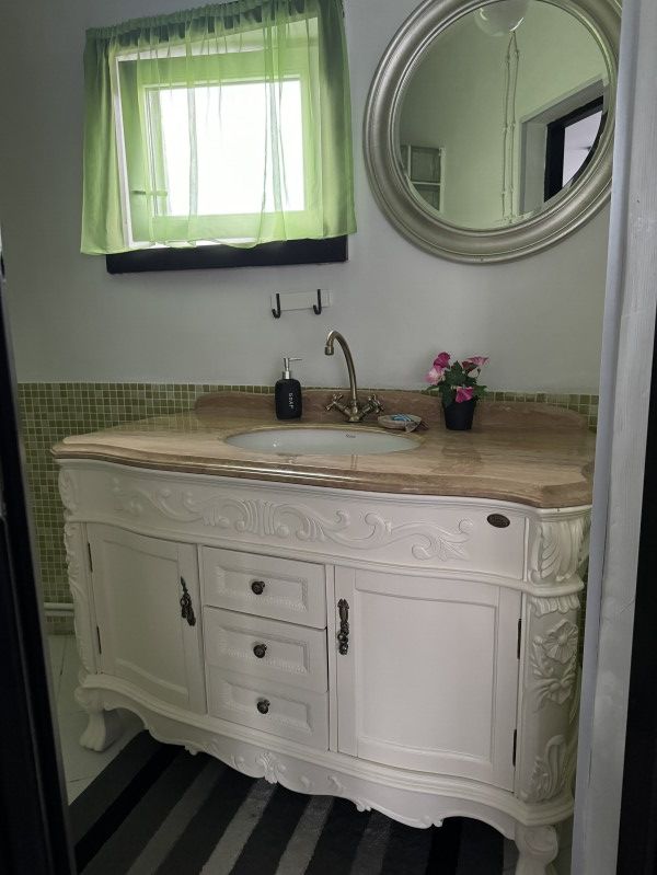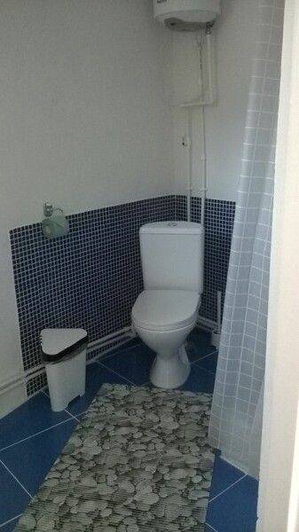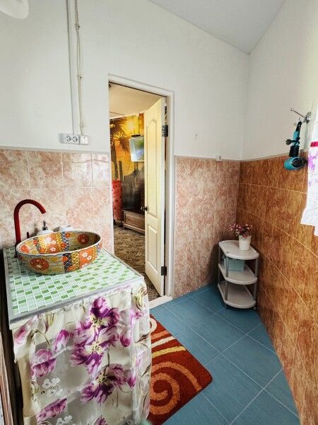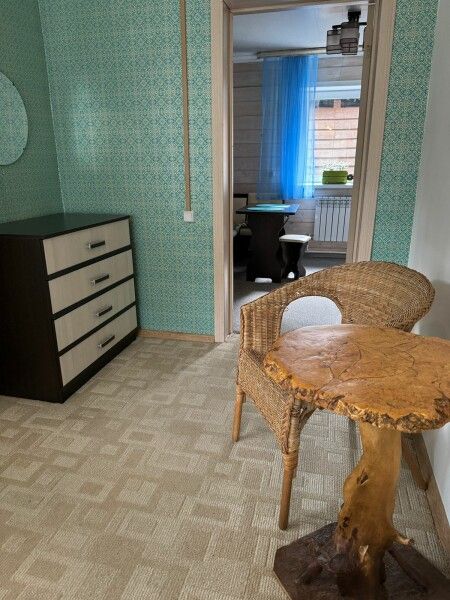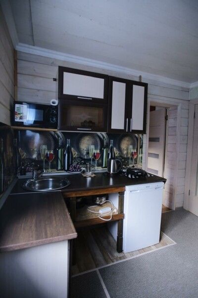 Вход в комнаты из кухни-столовой. Там есть кухонный гарнитур ручной работы, небольшой холодильник, микроволновка, встроенная плитка, чайник, вся необходимая посуда. Ванная комната просторная, с унитазом, раковиной, душевой кабиной.