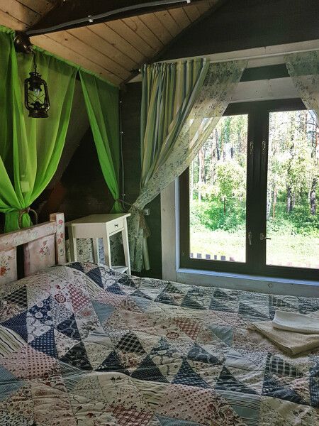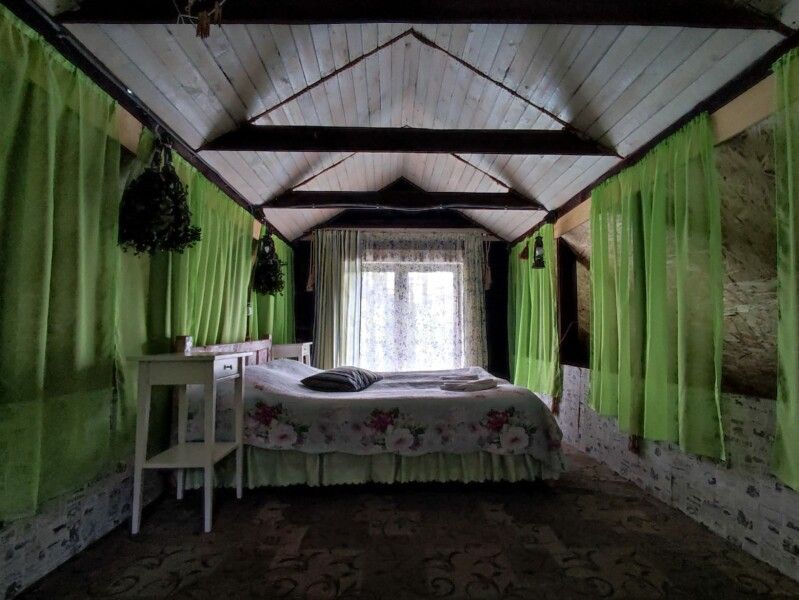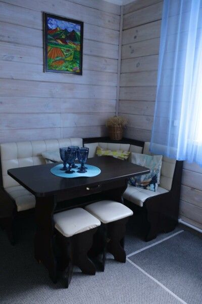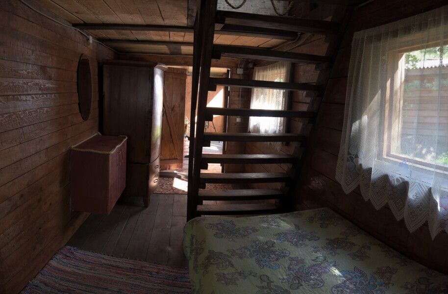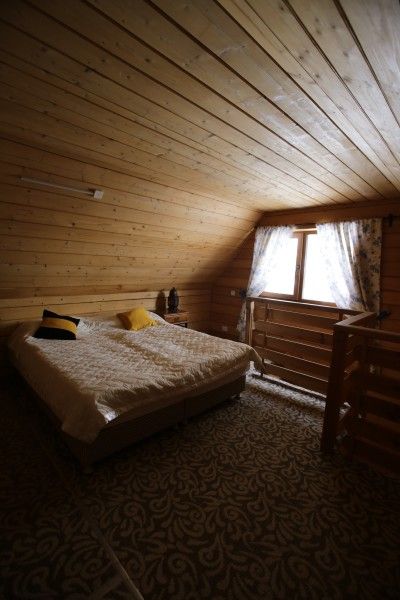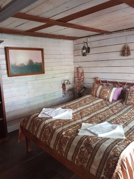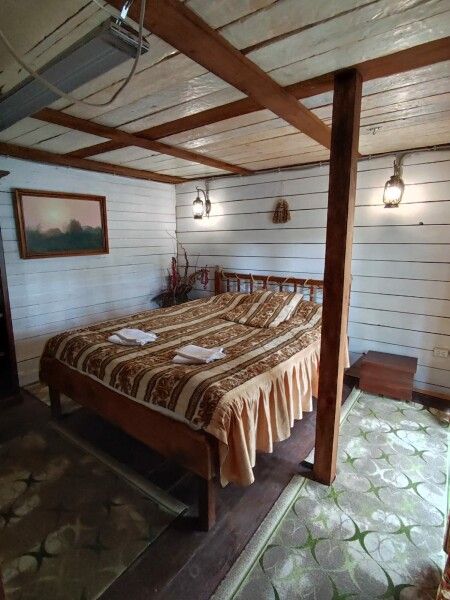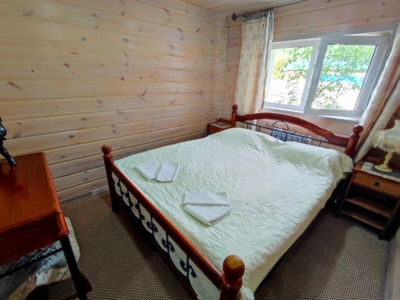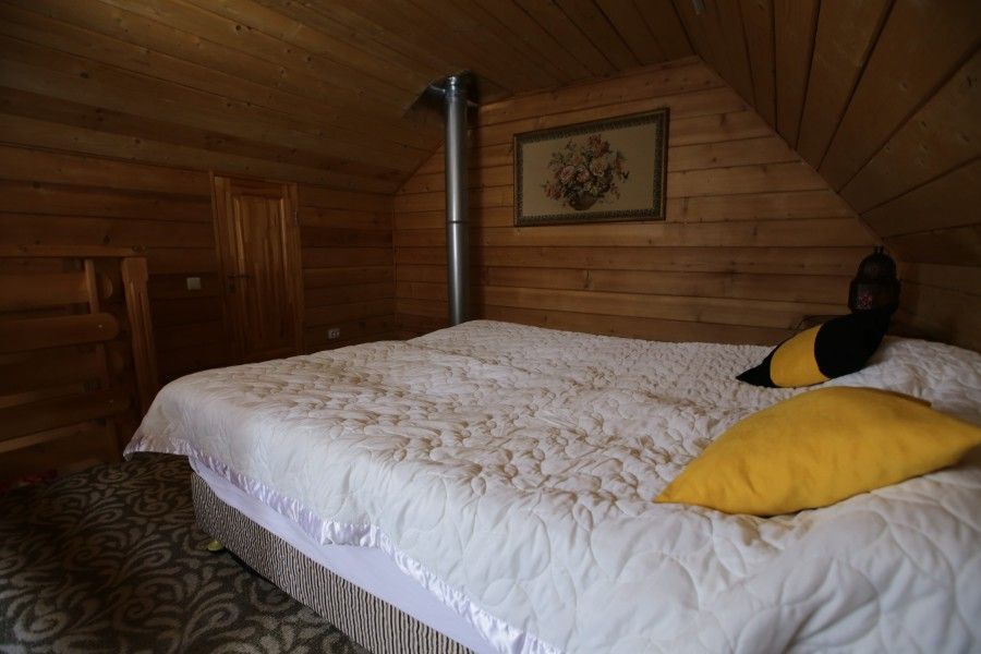 Деревянный двухэтажный дом с верандой. Одна двуспальная кровать и двуспальный диван. Четыре основных места плюс два дополнительных.