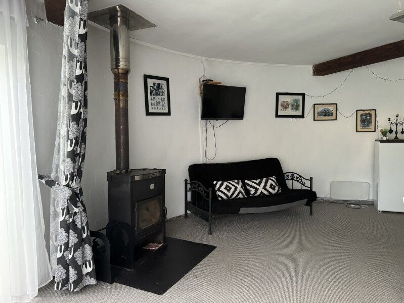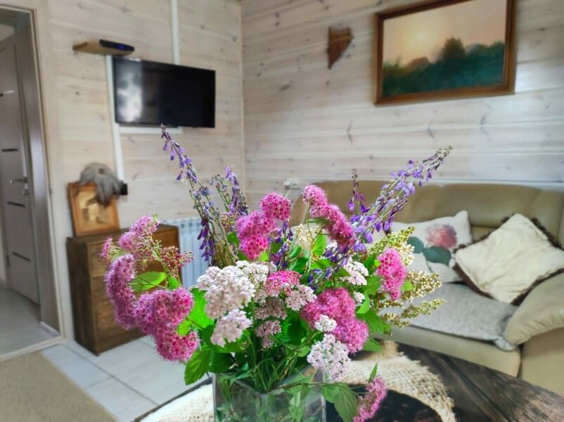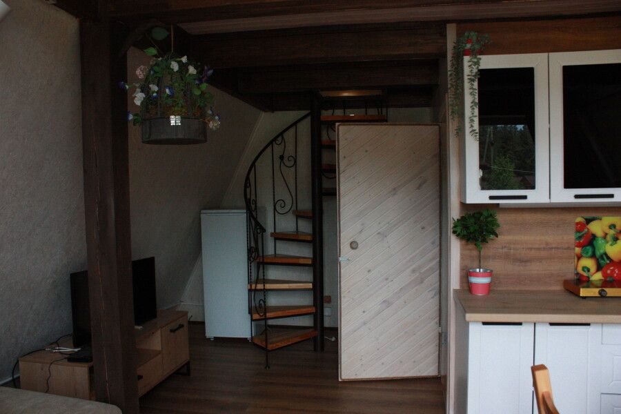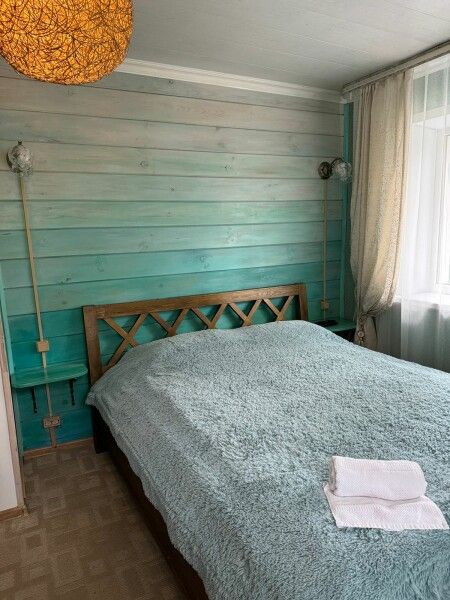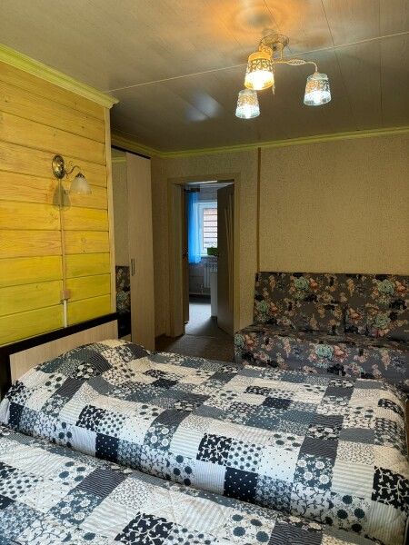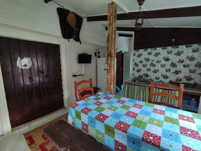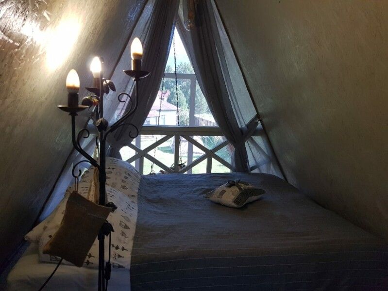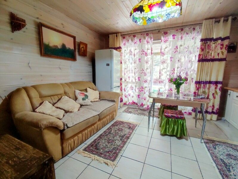 Деревянный двухэтажный дом с верандой. Одна двуспальная кровать и двуспальный диван. Четыре основных места плюс два дополнительных.