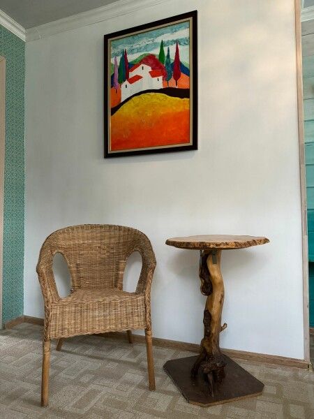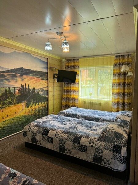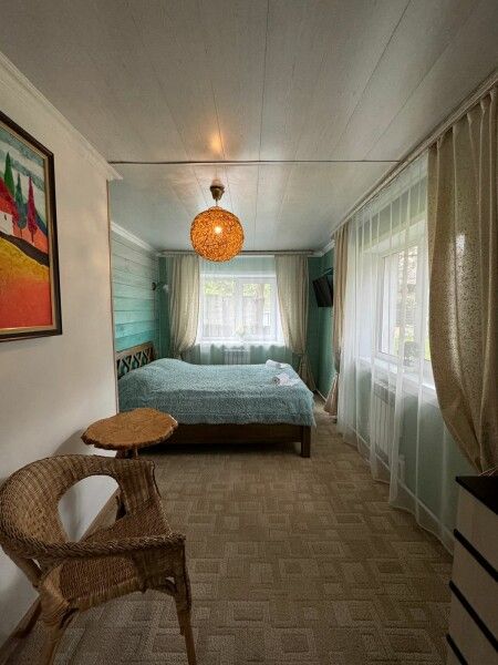Спальня с двуспальной кроватью, рядом интерьерный резной столик, кресло с гнутой спинкой и вместительный комод. В комнате два окна с видом на лес. ⠀ Вторая комната с двумя отдельными кроватями украшена картиной со светодиодной подсветкой, у каждой кровати свой светильник. Есть диван с полноценным двухспальным местом. В обеих комнатах есть телевизоры.