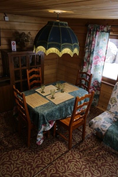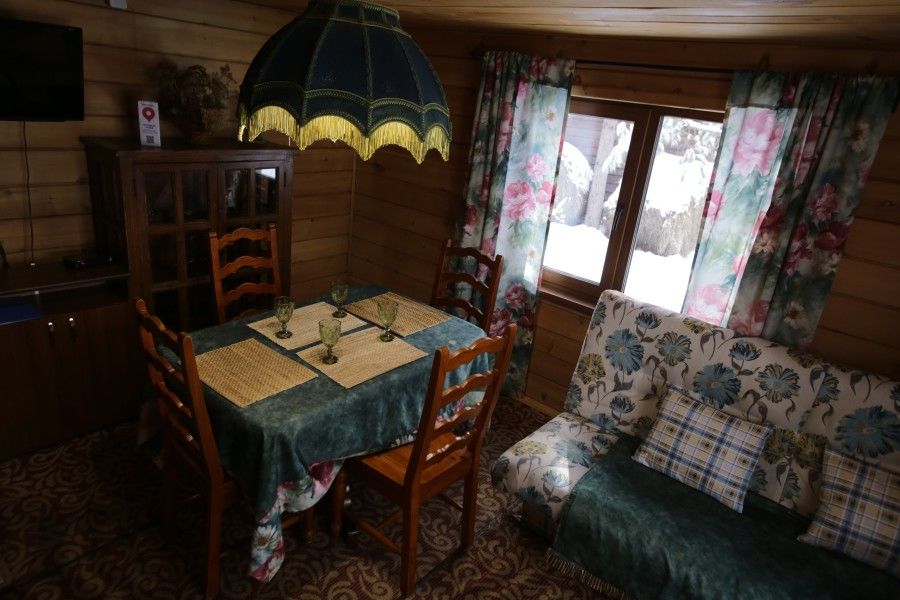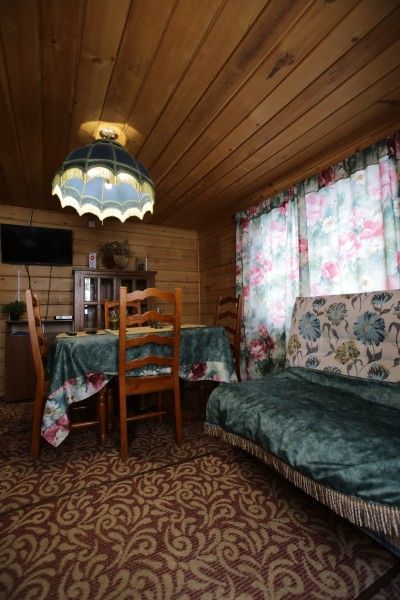 Зонирование делает этот домик особенно комфортным. Просторная двуспальная кровать. Посреди дома расположен большой стол. Широкий камин создает уютное настроение, пол застелен мягким ковролином.