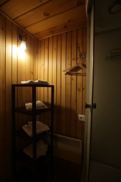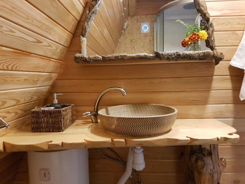 Санузел: унитаз, раковина, душ и пол с подогревом. Рядом с номером мангал и столик с лавками.