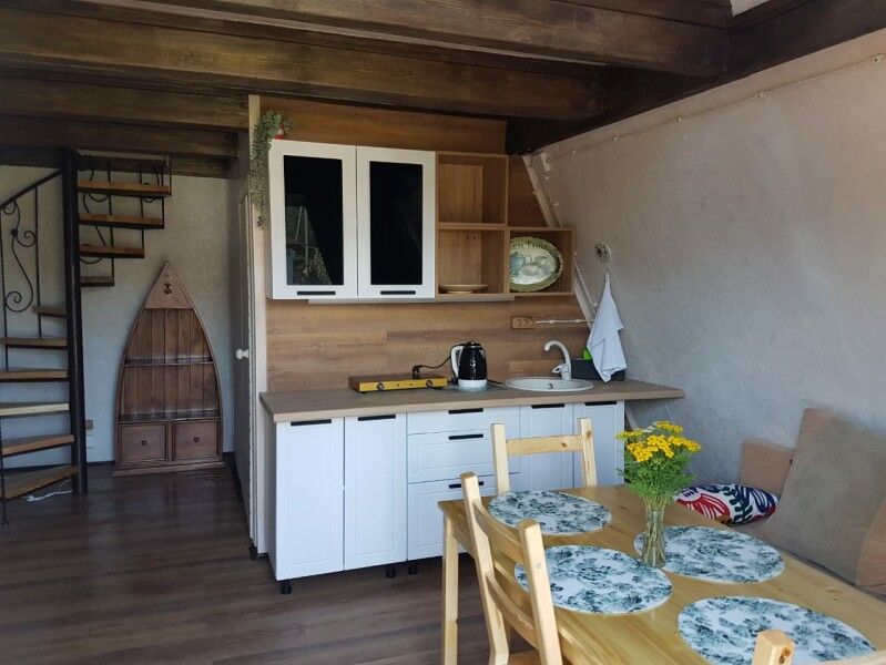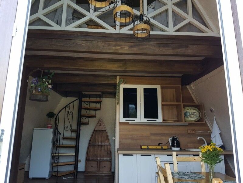 На первом этаже кухонная зона: плита, чайник, холодильник, микроволновка, есть два двуспальных дивана, обеденный стол и ТВ. На втором этаже двуспальная кровать, столик. На террасе — мангал, стол, лавки.