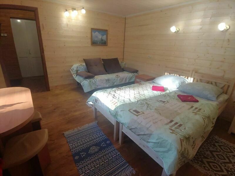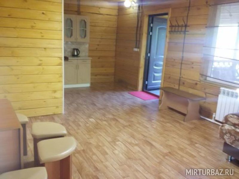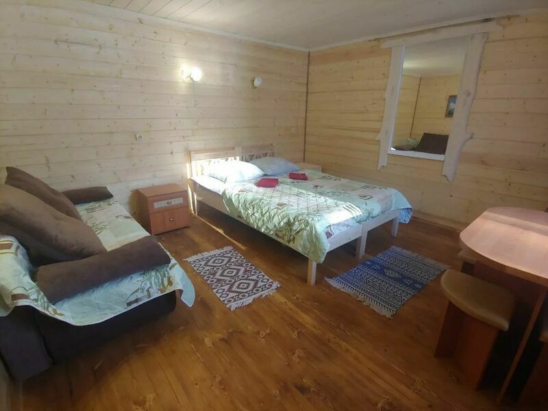 Левое крыло нового тёплого коттеджа с отдельным входом и отдельной террасой. Состоит из 3 комнат. Две спальни: в первой 2-сп кровать, тумбочки, вешалка; во второй 2-сп и 1-сп кровать, тумбочки, вешалка. В гостиной 2-местный диван, стол, телевизор, кухонный уголок с чайником и холодильником. WC, горячая вода, душевая кабина в крыле собственные. Бесплатный Wi-Fi.