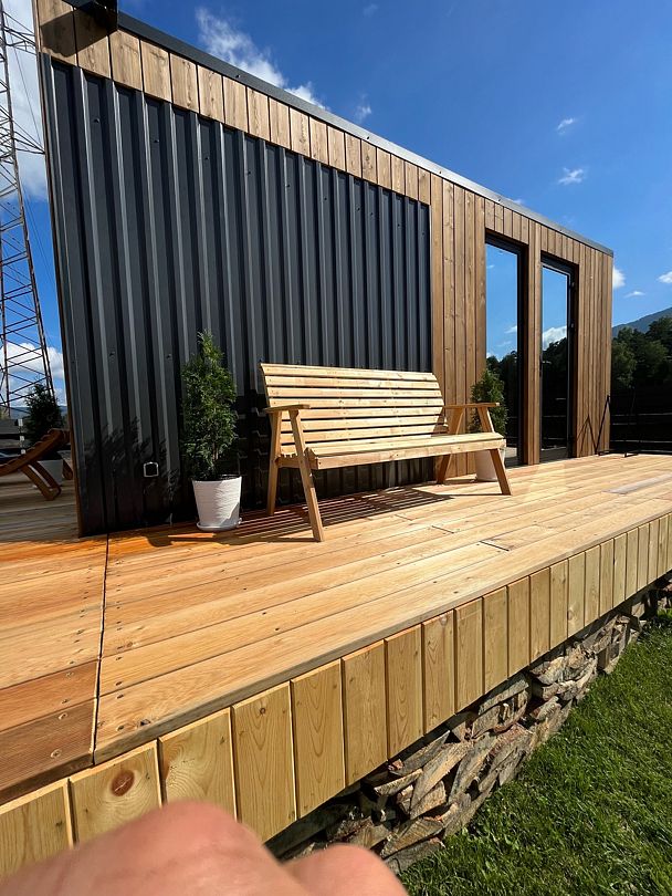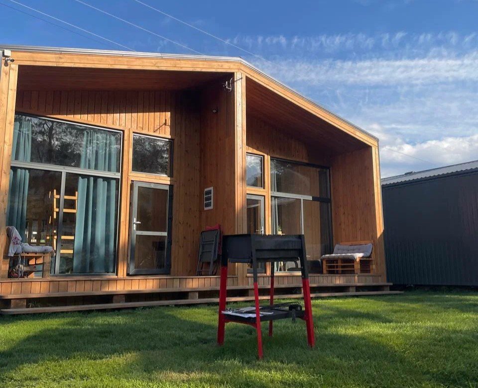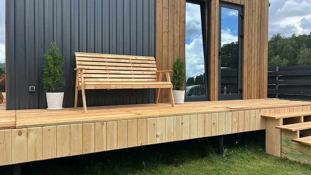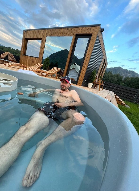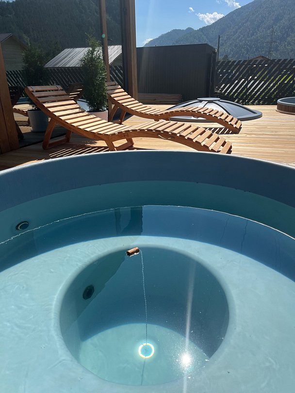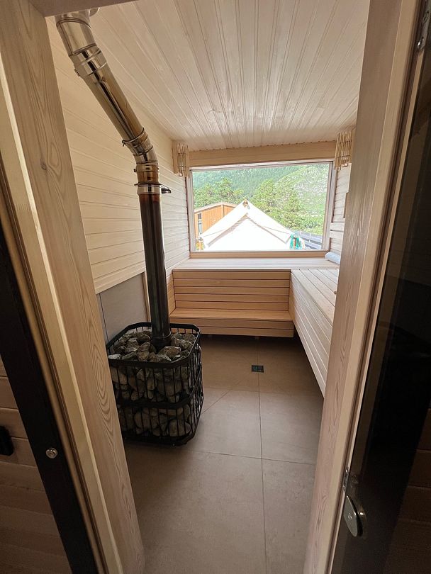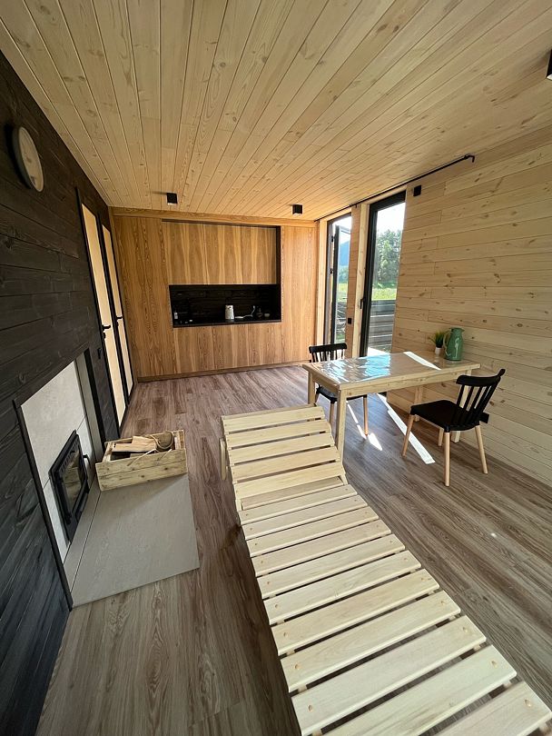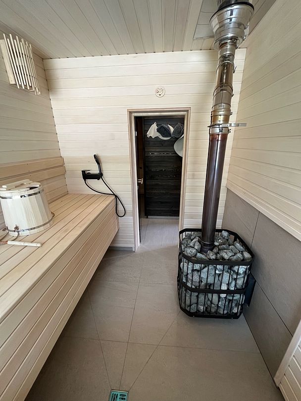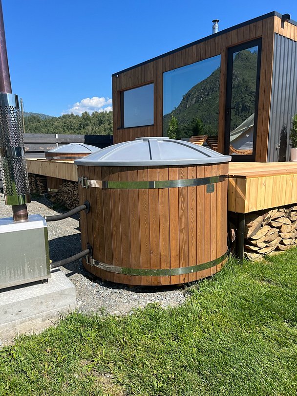 Помимо удобств домика, расслабиться вам поможет баня и чан на открытом воздухе.