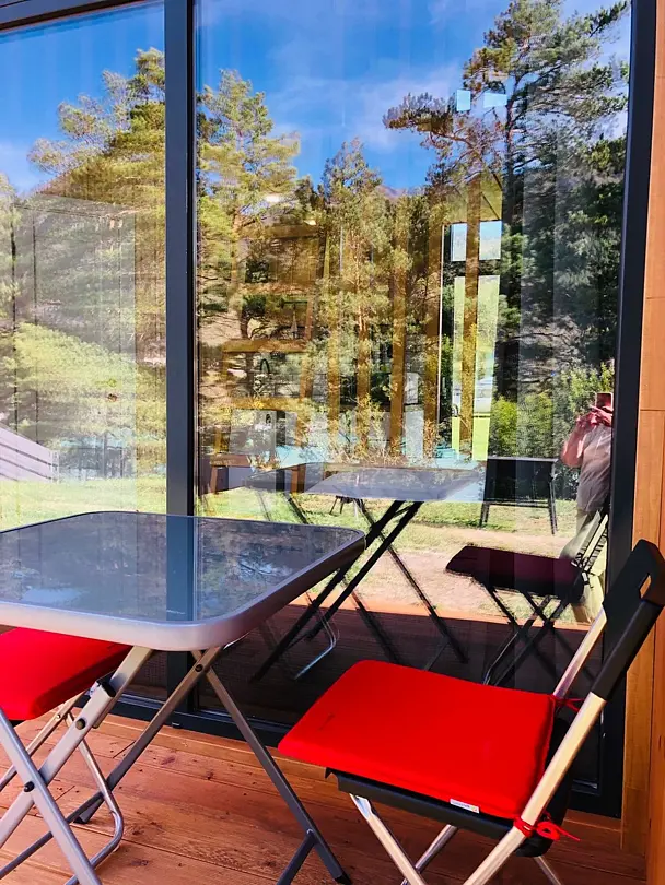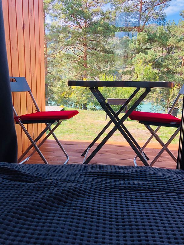 В домике: Wi-FI бесплатно, телевизор, панорамное окно с видом на реку. Катунь и горы, две кровати, постельное белье (белое), набор полотенец (большое, среднее), барный стол, барные стулья, диван, шкаф.